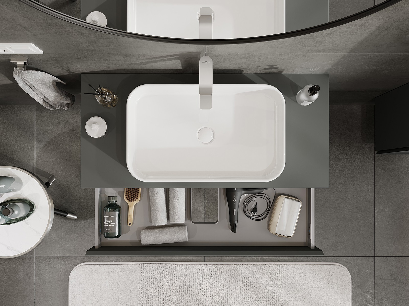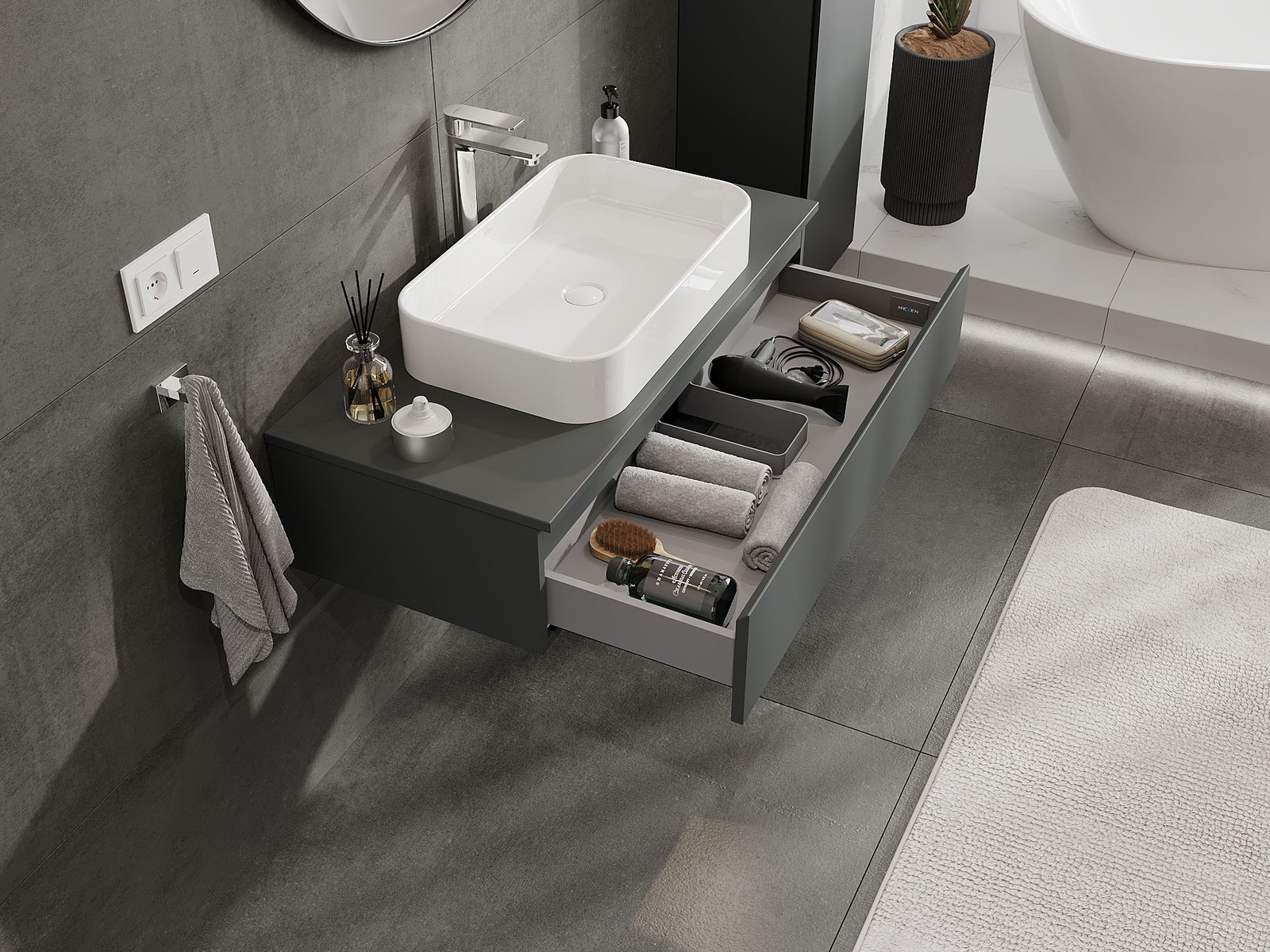 Mūsų moduliniai vonios baldai gali būti derinami tarpusavyje įvairiomis spalvų konfigūracijomis, leidžiant visiškai pritaikyti pagal asmeninius poreikius. Galima pasirinkti tiek atskirų elementų išvaizdą, tiek funkcijas, kas leidžia baldus pritaikyti pagal savo stiliaus ir naudojimo preferencijas.