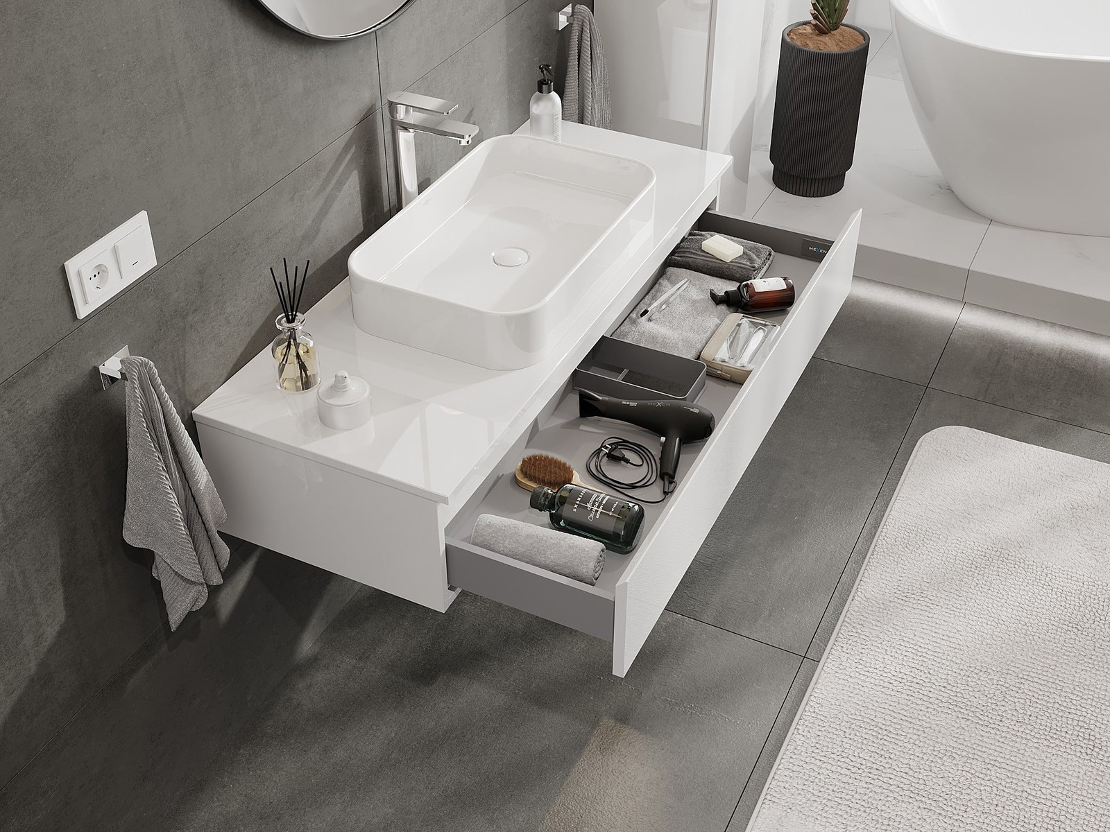 Mūsų moduliniai vonios baldai gali būti derinami tarpusavyje įvairiomis spalvų konfigūracijomis, leidžiant visiškai pritaikyti pagal asmeninius poreikius. Galima pasirinkti tiek atskirų elementų išvaizdą, tiek funkcijas, kas leidžia baldus pritaikyti pagal savo stiliaus ir naudojimo preferencijas.