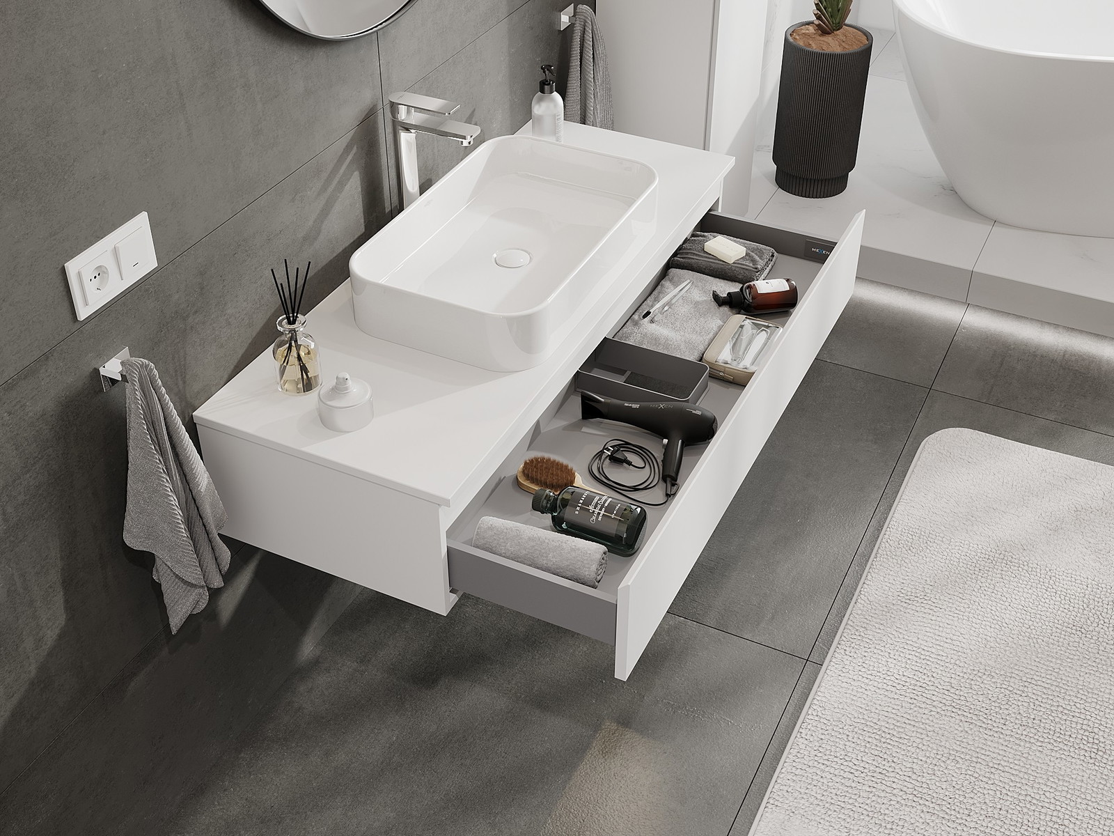 Mūsų moduliniai vonios baldai gali būti derinami tarpusavyje įvairiomis spalvų konfigūracijomis, leidžiant visiškai pritaikyti pagal asmeninius poreikius. Galima pasirinkti tiek atskirų elementų išvaizdą, tiek funkcijas, kas leidžia baldus pritaikyti pagal savo stiliaus ir naudojimo preferencijas.