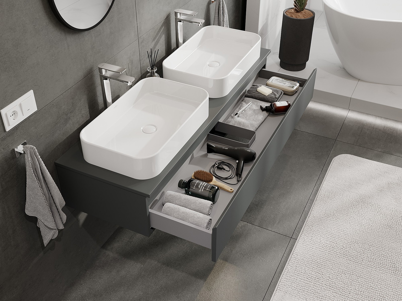 Mūsų moduliniai vonios baldai gali būti derinami tarpusavyje įvairiomis spalvų konfigūracijomis, leidžiant visiškai pritaikyti pagal asmeninius poreikius. Galima pasirinkti tiek atskirų elementų išvaizdą, tiek funkcijas, kas leidžia baldus pritaikyti pagal savo stiliaus ir naudojimo preferencijas.