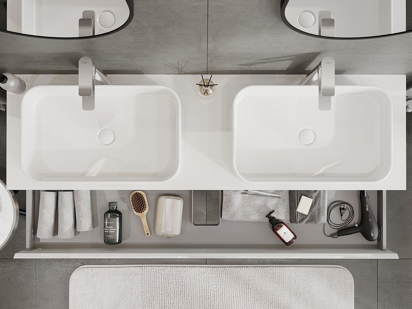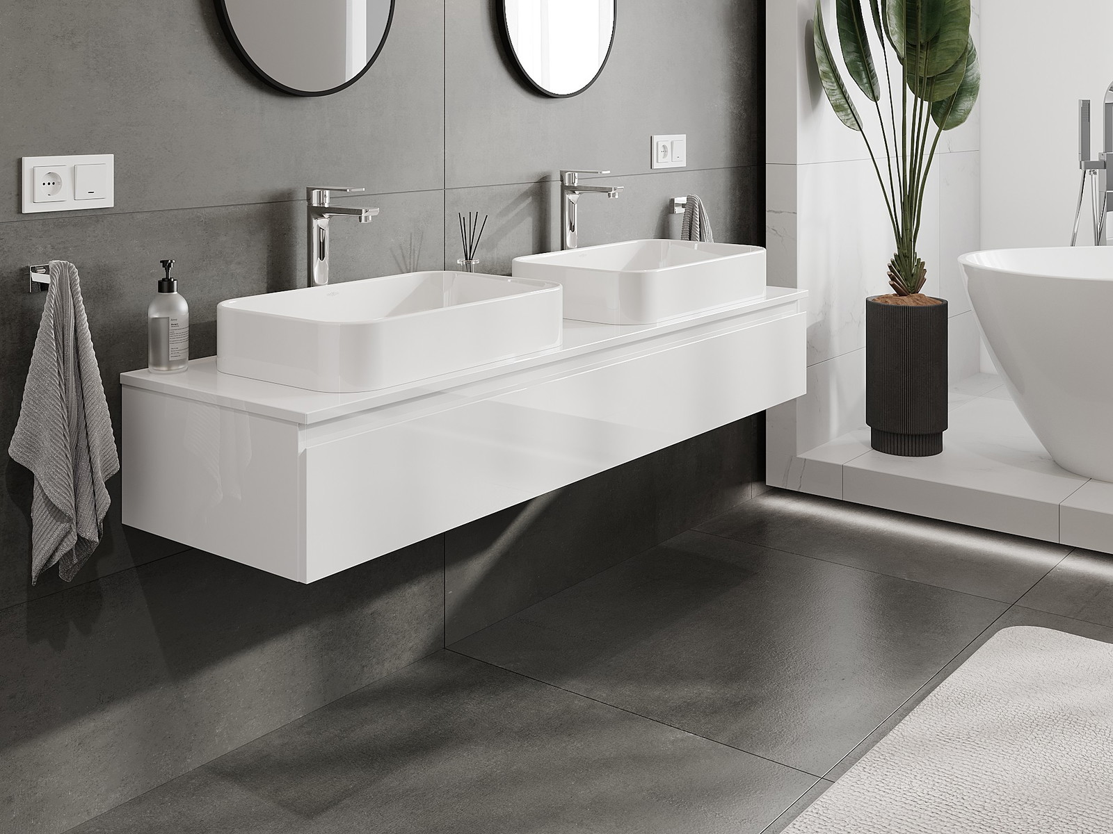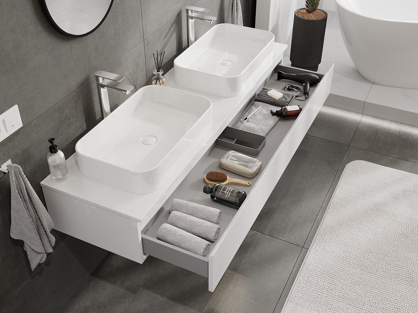Mūsų moduliniai vonios baldai gali būti derinami tarpusavyje įvairiomis spalvų konfigūracijomis, leidžiant visiškai pritaikyti pagal asmeninius poreikius. Galima pasirinkti tiek atskirų elementų išvaizdą, tiek funkcijas, kas leidžia baldus pritaikyti pagal savo stiliaus ir naudojimo preferencijas.
