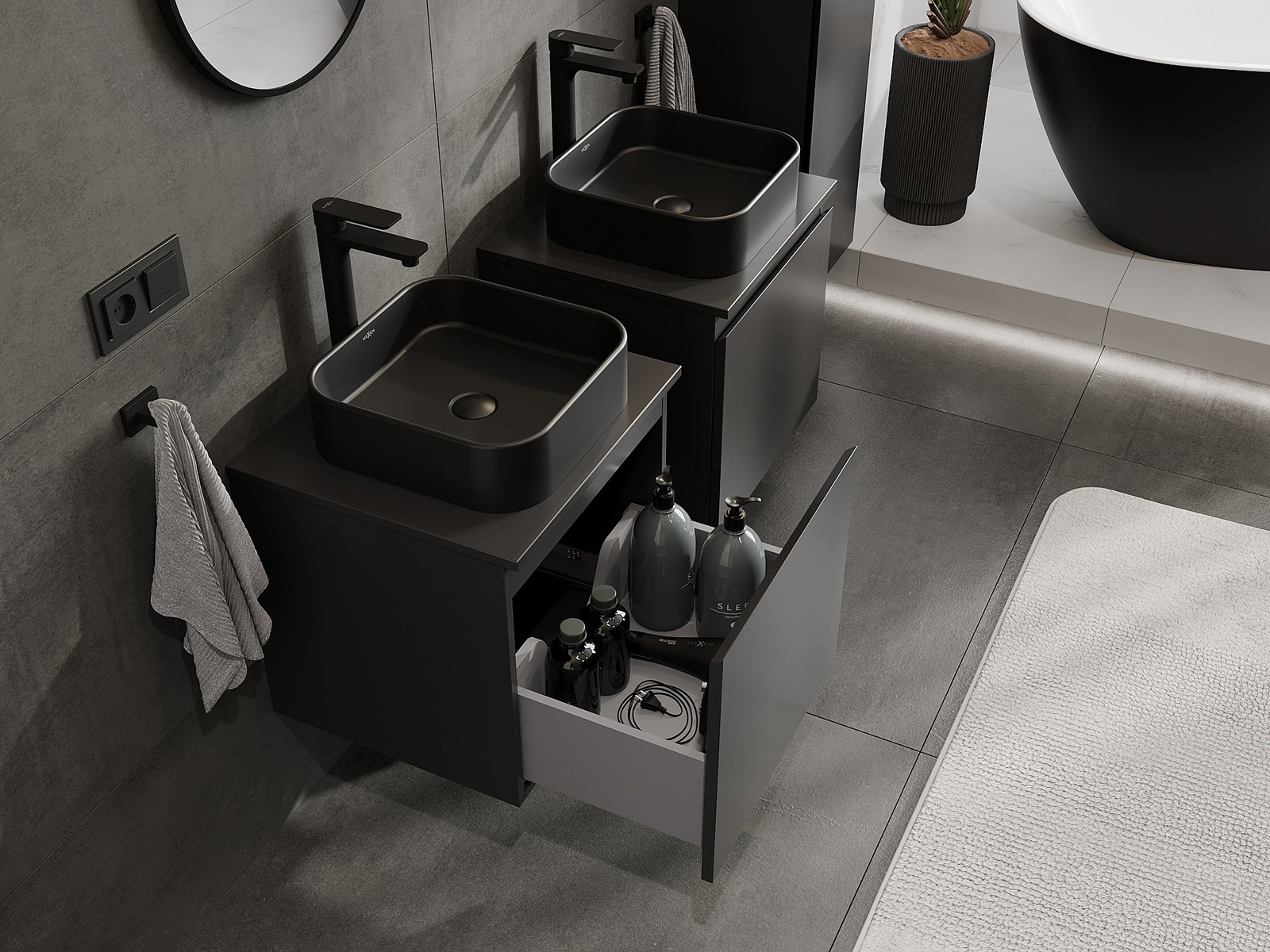 Mūsų moduliniai vonios baldai gali būti derinami tarpusavyje įvairiomis spalvų konfigūracijomis, leidžiant visiškai pritaikyti pagal asmeninius poreikius. Galima pasirinkti tiek atskirų elementų išvaizdą, tiek funkcijas, kas leidžia baldus pritaikyti pagal savo stiliaus ir naudojimo preferencijas.