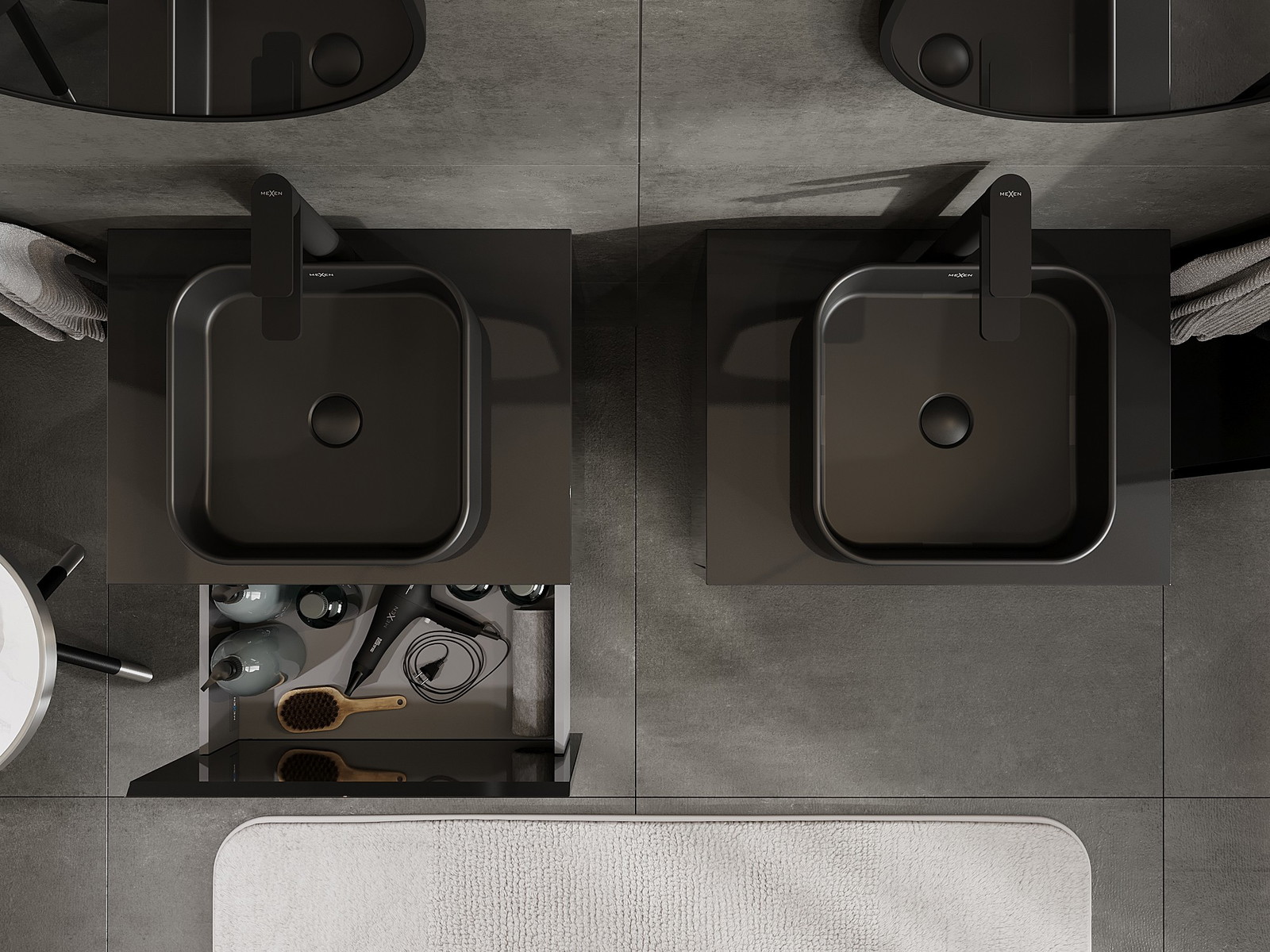 Mexen Orio vonios spintelė po praustuvu 60 cm su stalviršiu, 1 stalčius, juodas blizgus - 91A10-06047-1-BFC70