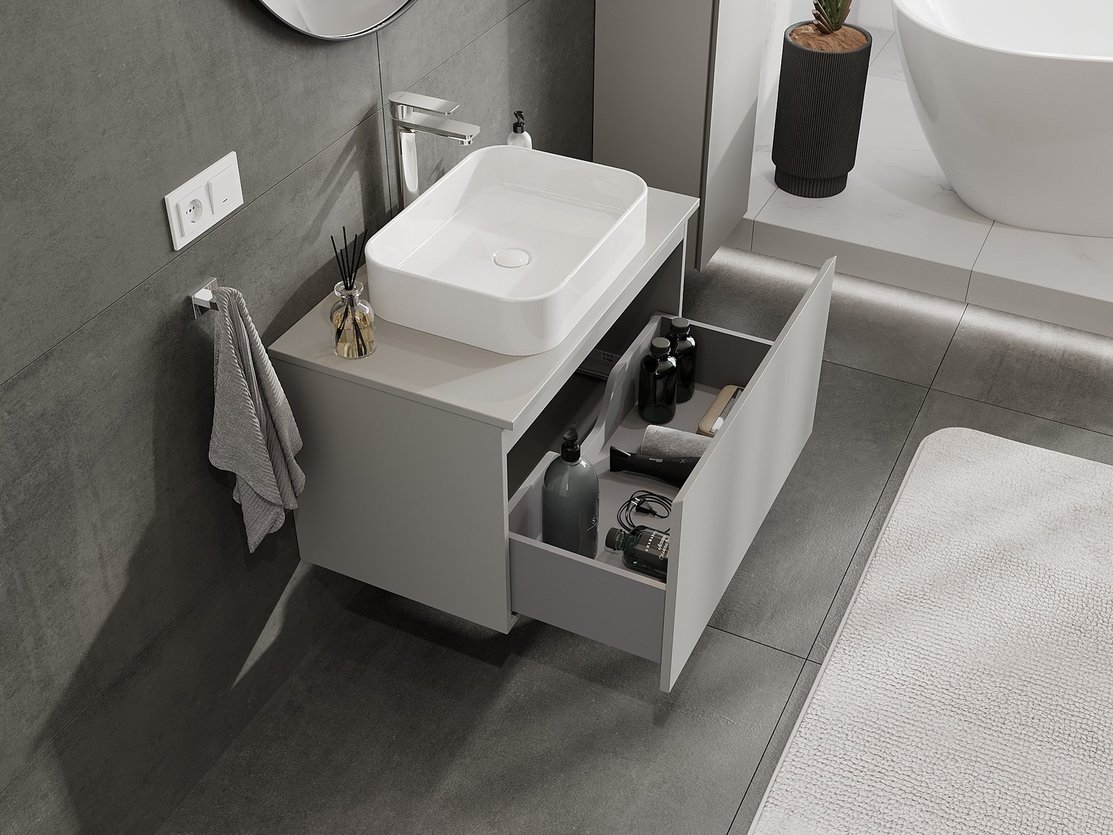 Mūsų moduliniai vonios baldai gali būti derinami tarpusavyje įvairiomis spalvų konfigūracijomis, leidžiant visiškai pritaikyti pagal asmeninius poreikius. Galima pasirinkti tiek atskirų elementų išvaizdą, tiek funkcijas, kas leidžia baldus pritaikyti pagal savo stiliaus ir naudojimo preferencijas.
