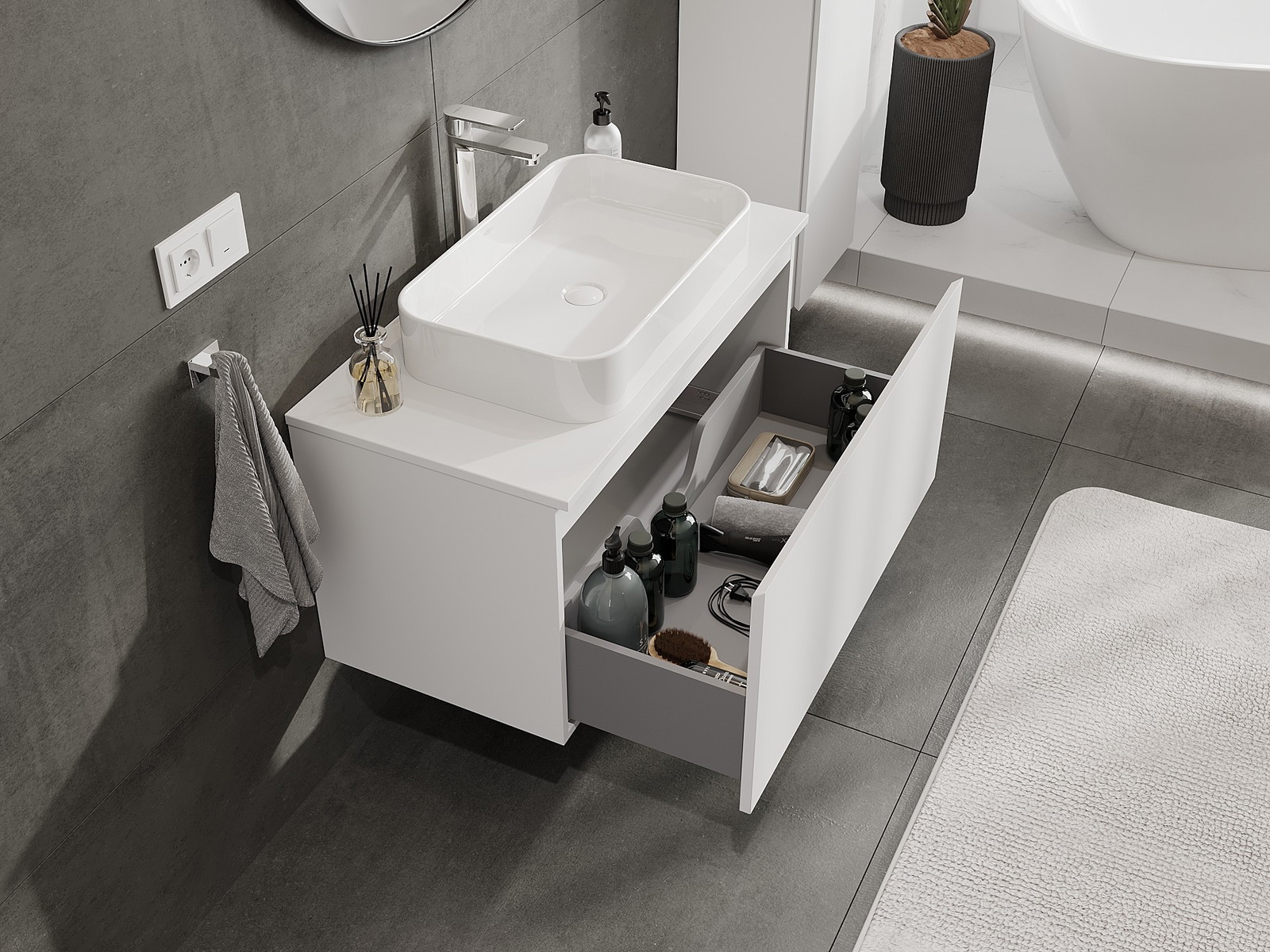 Mūsų moduliniai vonios baldai gali būti derinami tarpusavyje įvairiomis spalvų konfigūracijomis, leidžiant visiškai pritaikyti pagal asmeninius poreikius. Galima pasirinkti tiek atskirų elementų išvaizdą, tiek funkcijas, kas leidžia baldus pritaikyti pagal savo stiliaus ir naudojimo preferencijas.