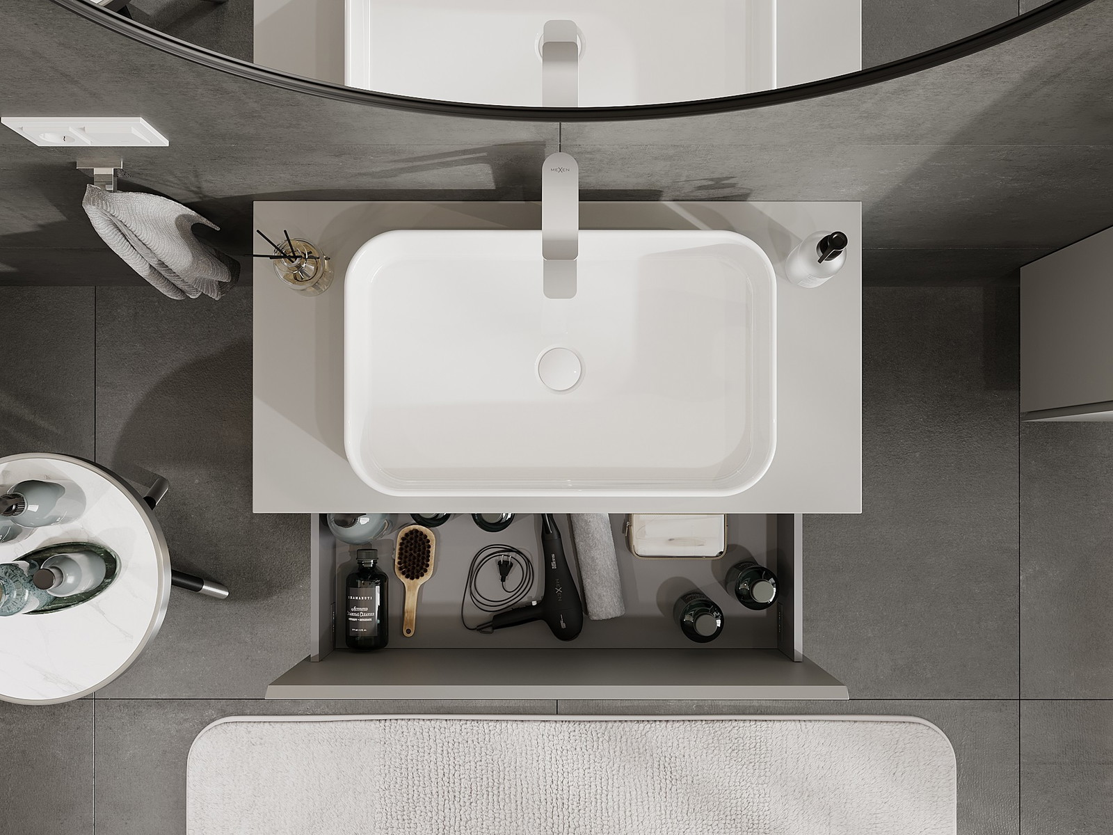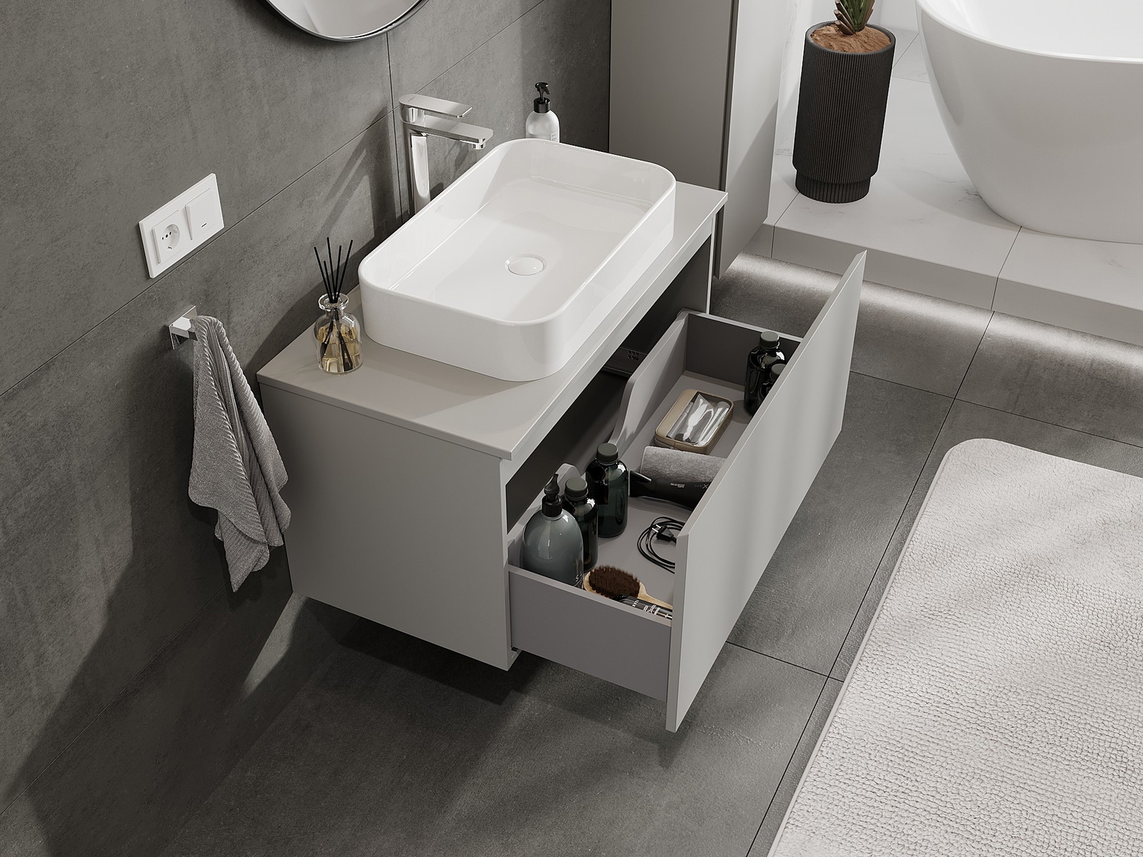 Mūsų moduliniai vonios baldai gali būti derinami tarpusavyje įvairiomis spalvų konfigūracijomis, leidžiant visiškai pritaikyti pagal asmeninius poreikius. Galima pasirinkti tiek atskirų elementų išvaizdą, tiek funkcijas, kas leidžia baldus pritaikyti pagal savo stiliaus ir naudojimo preferencijas.