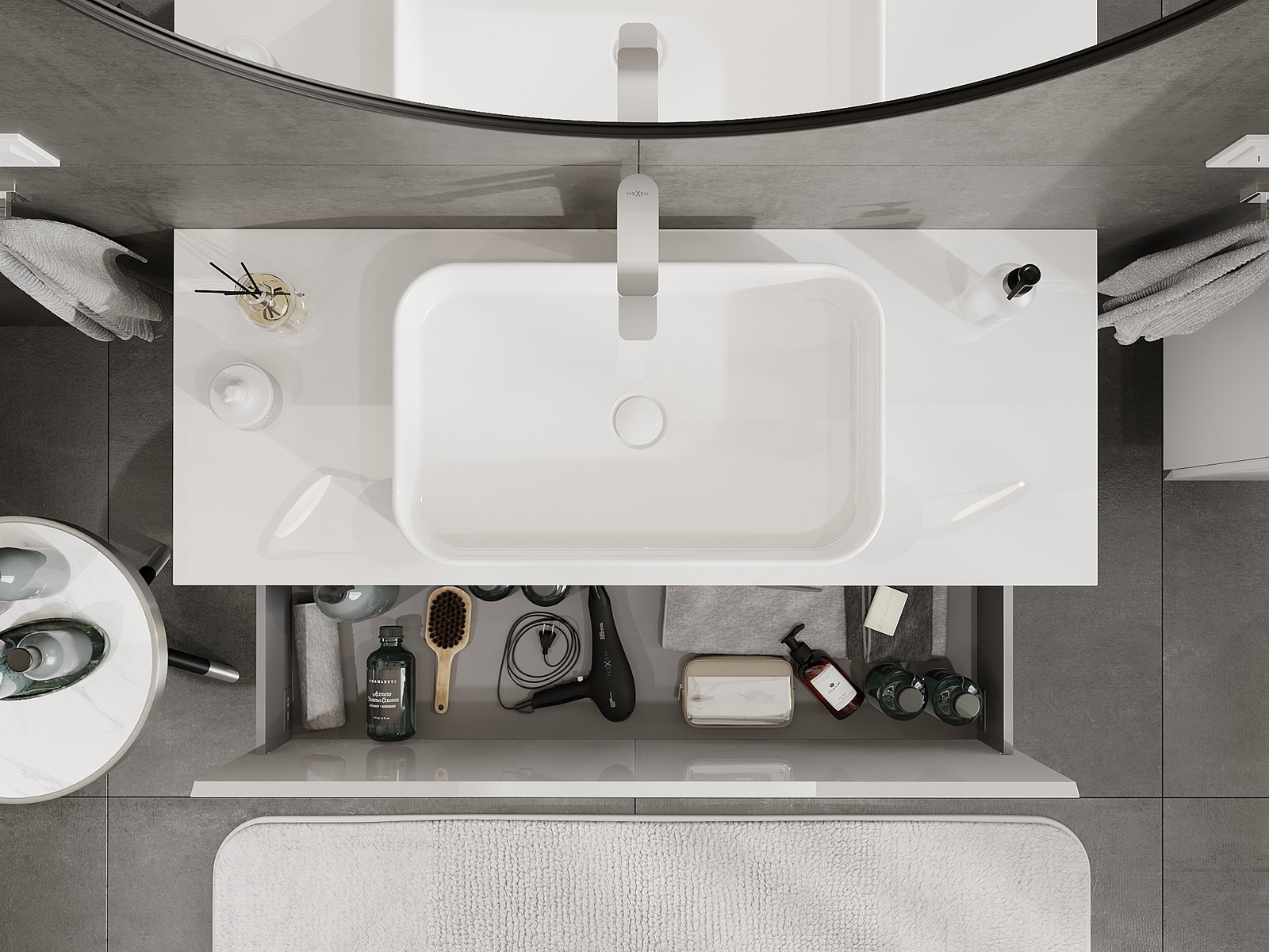 Mūsų moduliniai vonios baldai gali būti derinami tarpusavyje įvairiomis spalvų konfigūracijomis, leidžiant visiškai pritaikyti pagal asmeninius poreikius. Galima pasirinkti tiek atskirų elementų išvaizdą, tiek funkcijas, kas leidžia baldus pritaikyti pagal savo stiliaus ir naudojimo preferencijas.