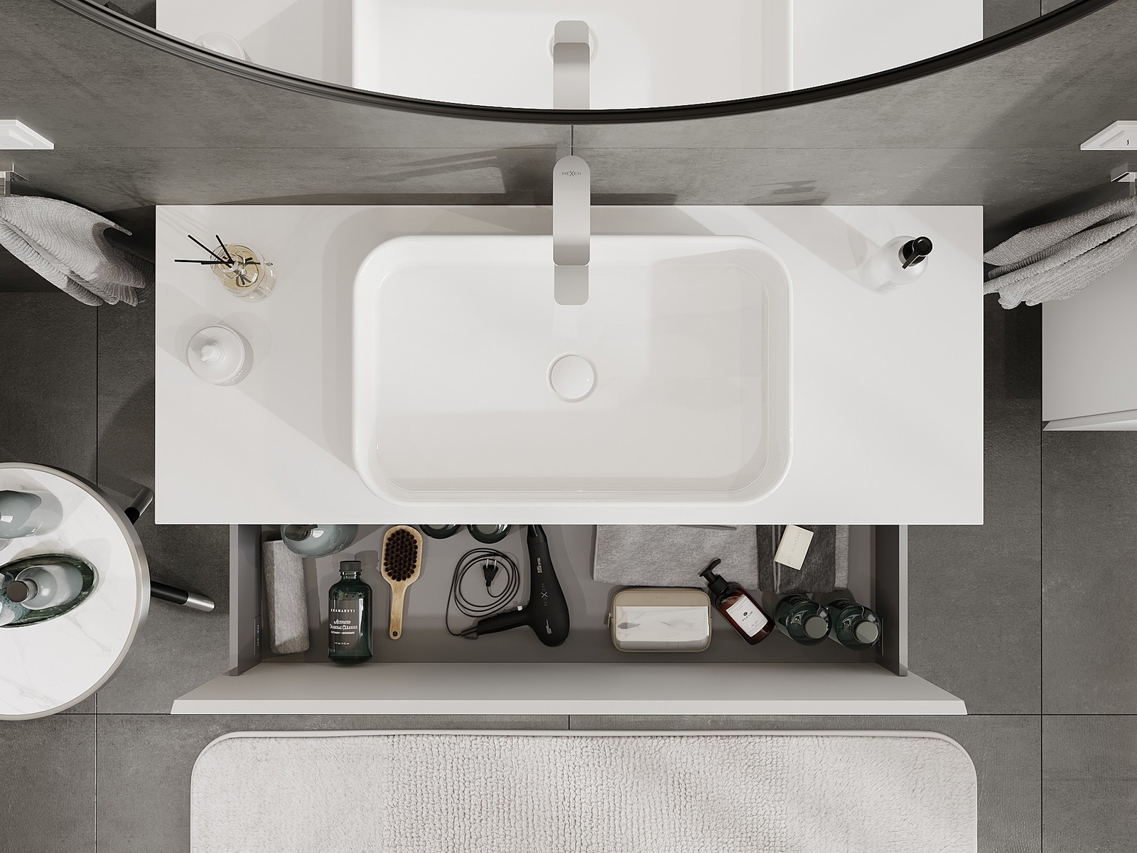 Mūsų moduliniai vonios baldai gali būti derinami tarpusavyje įvairiomis spalvų konfigūracijomis, leidžiant visiškai pritaikyti pagal asmeninius poreikius. Galima pasirinkti tiek atskirų elementų išvaizdą, tiek funkcijas, kas leidžia baldus pritaikyti pagal savo stiliaus ir naudojimo preferencijas.