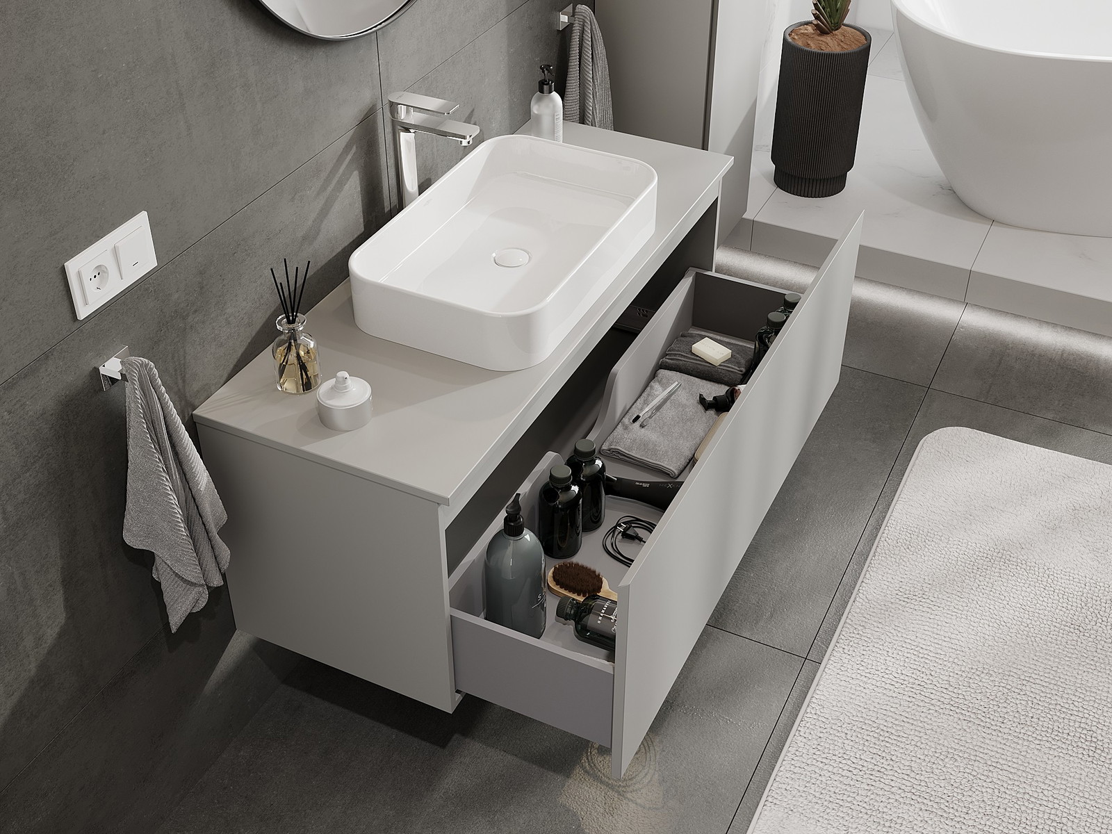 Mūsų moduliniai vonios baldai gali būti derinami tarpusavyje įvairiomis spalvų konfigūracijomis, leidžiant visiškai pritaikyti pagal asmeninius poreikius. Galima pasirinkti tiek atskirų elementų išvaizdą, tiek funkcijas, kas leidžia baldus pritaikyti pagal savo stiliaus ir naudojimo preferencijas.