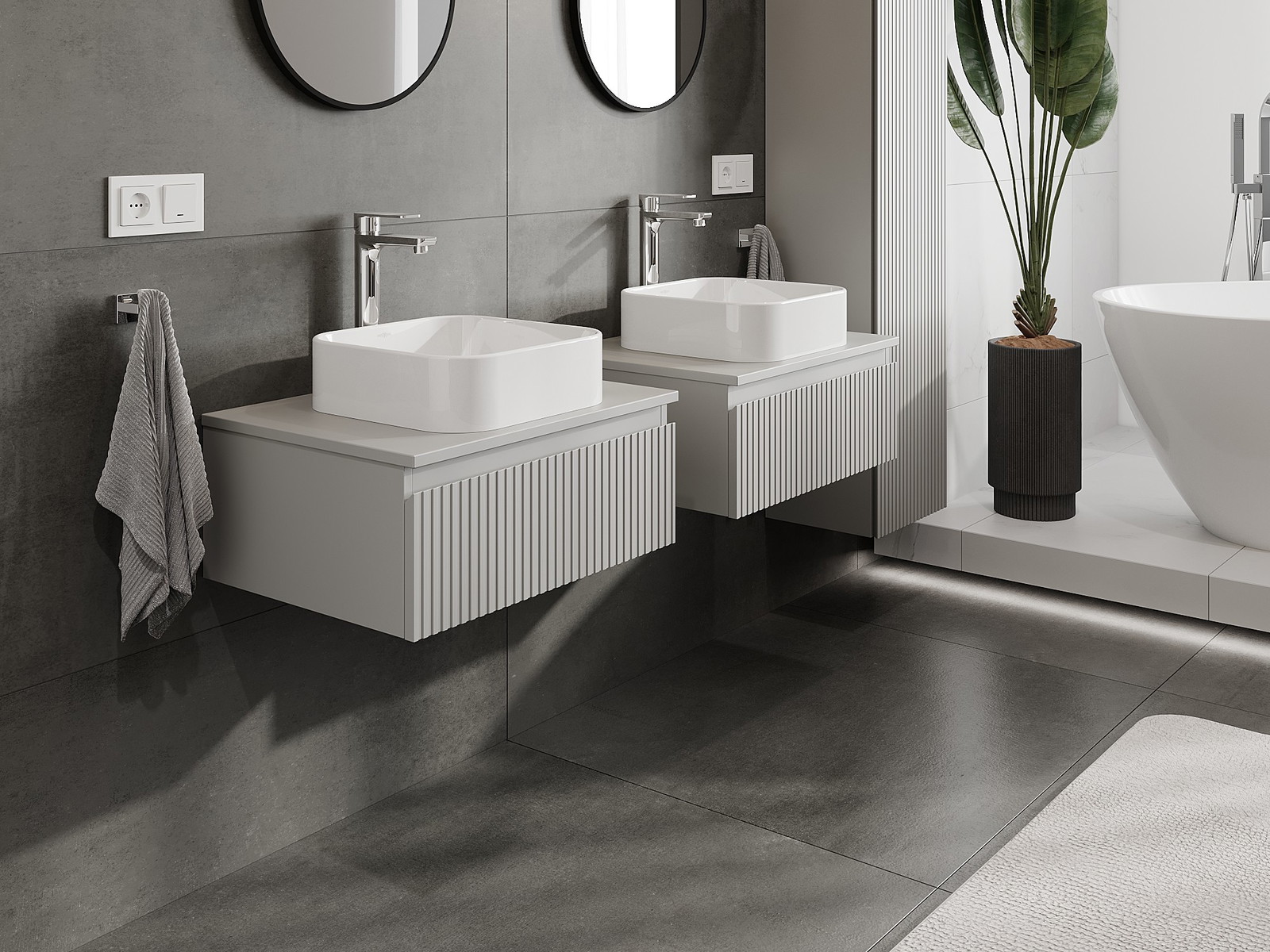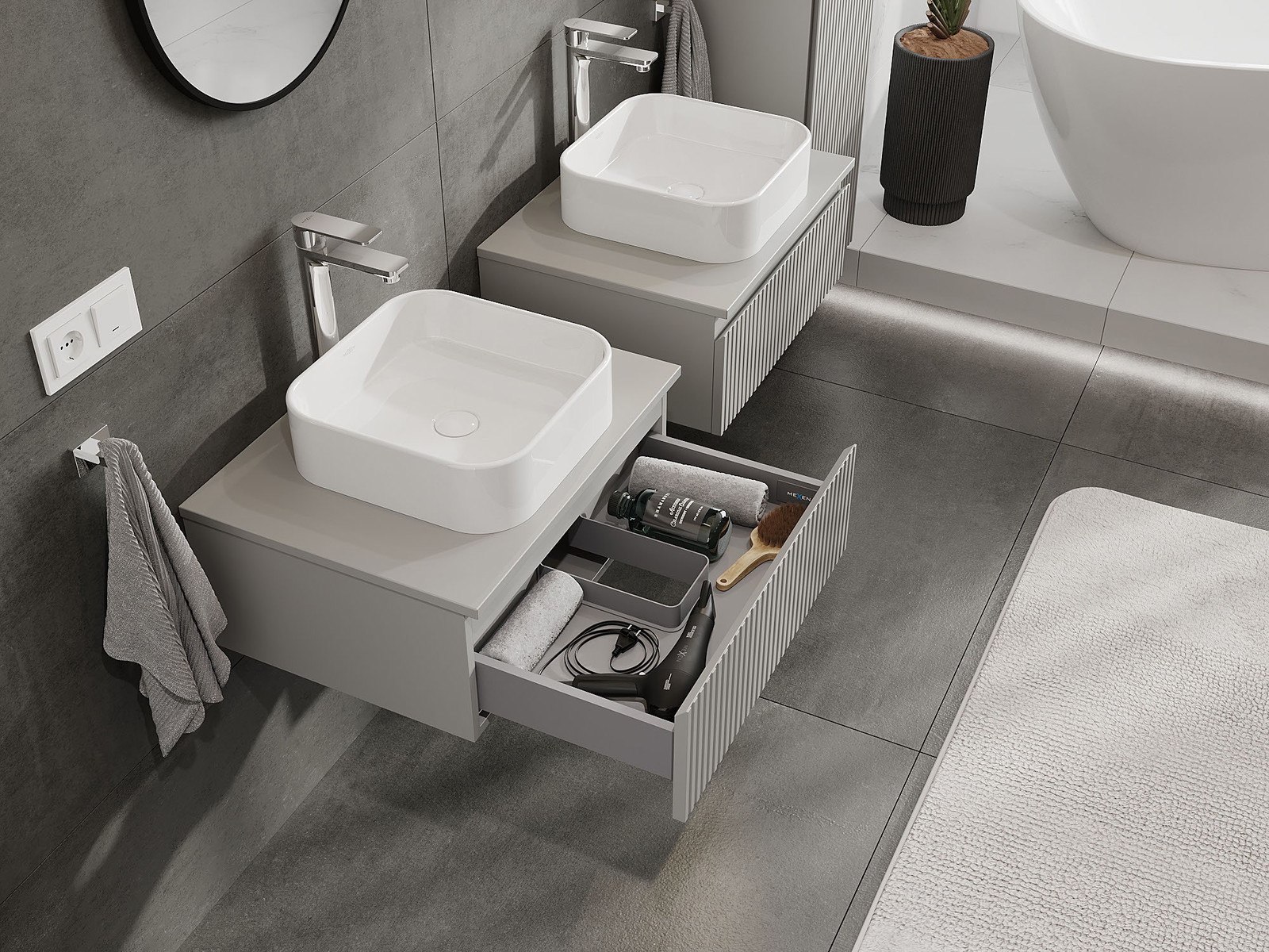 Mūsų moduliniai vonios baldai gali būti derinami tarpusavyje įvairiomis spalvų konfigūracijomis, leidžiant visiškai pritaikyti pagal asmeninius poreikius. Galima pasirinkti tiek atskirų elementų išvaizdą, tiek funkcijas, kas leidžia baldus pritaikyti pagal savo stiliaus ir naudojimo preferencijas.