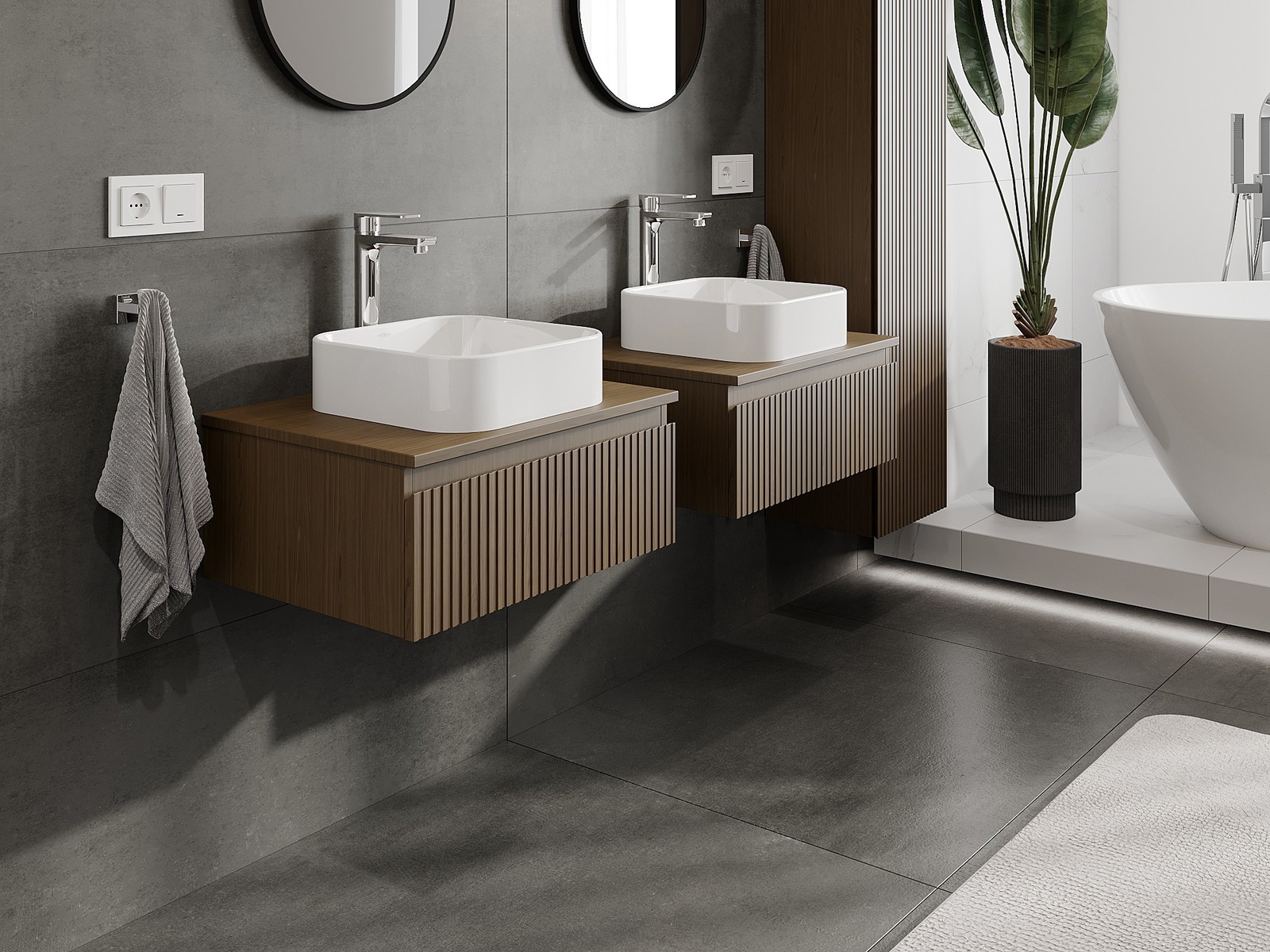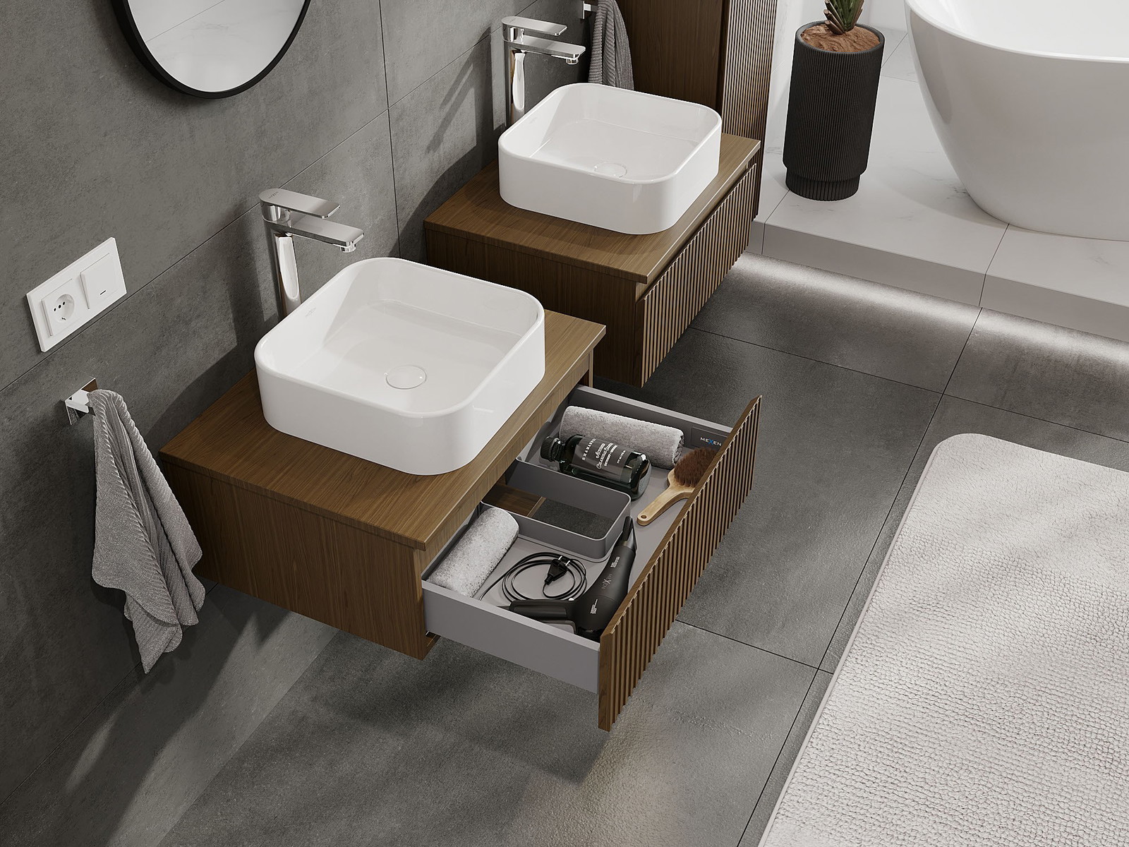 Mūsų moduliniai vonios baldai gali būti derinami tarpusavyje įvairiomis spalvų konfigūracijomis, leidžiant visiškai pritaikyti pagal asmeninius poreikius. Galima pasirinkti tiek atskirų elementų išvaizdą, tiek funkcijas, kas leidžia baldus pritaikyti pagal savo stiliaus ir naudojimo preferencijas.