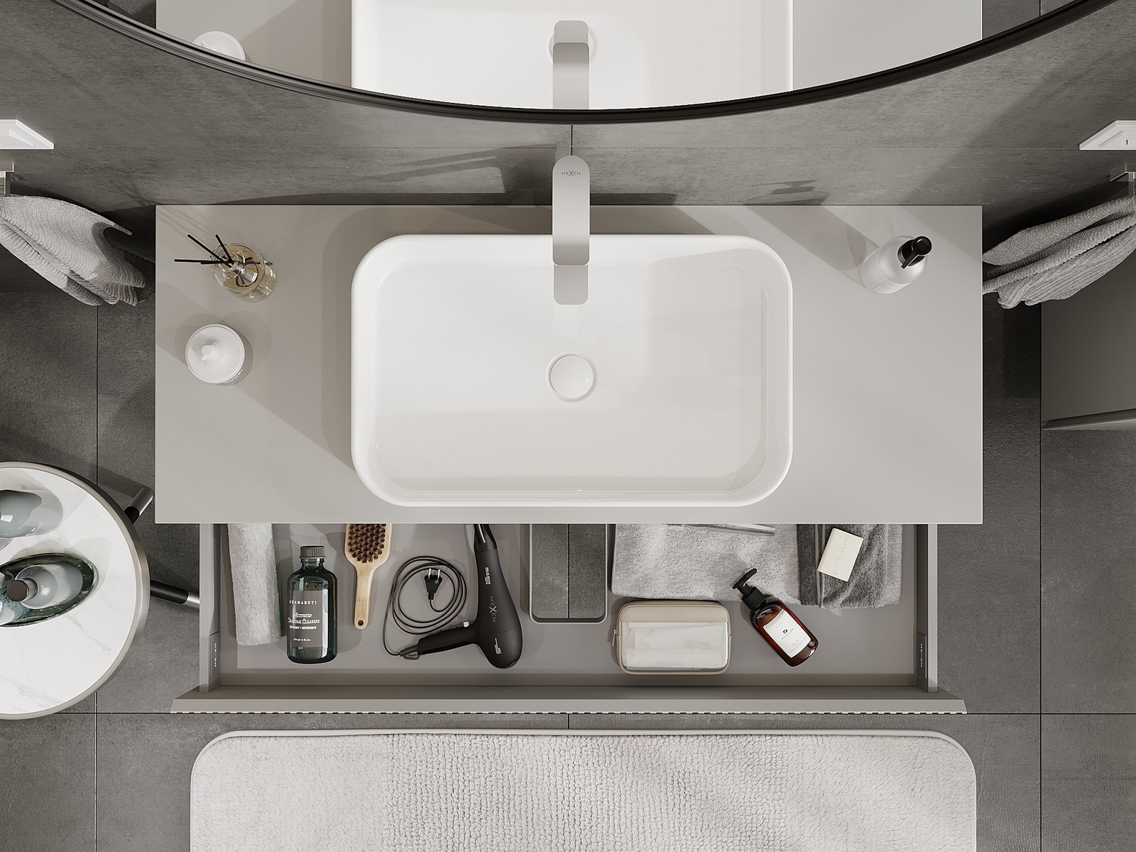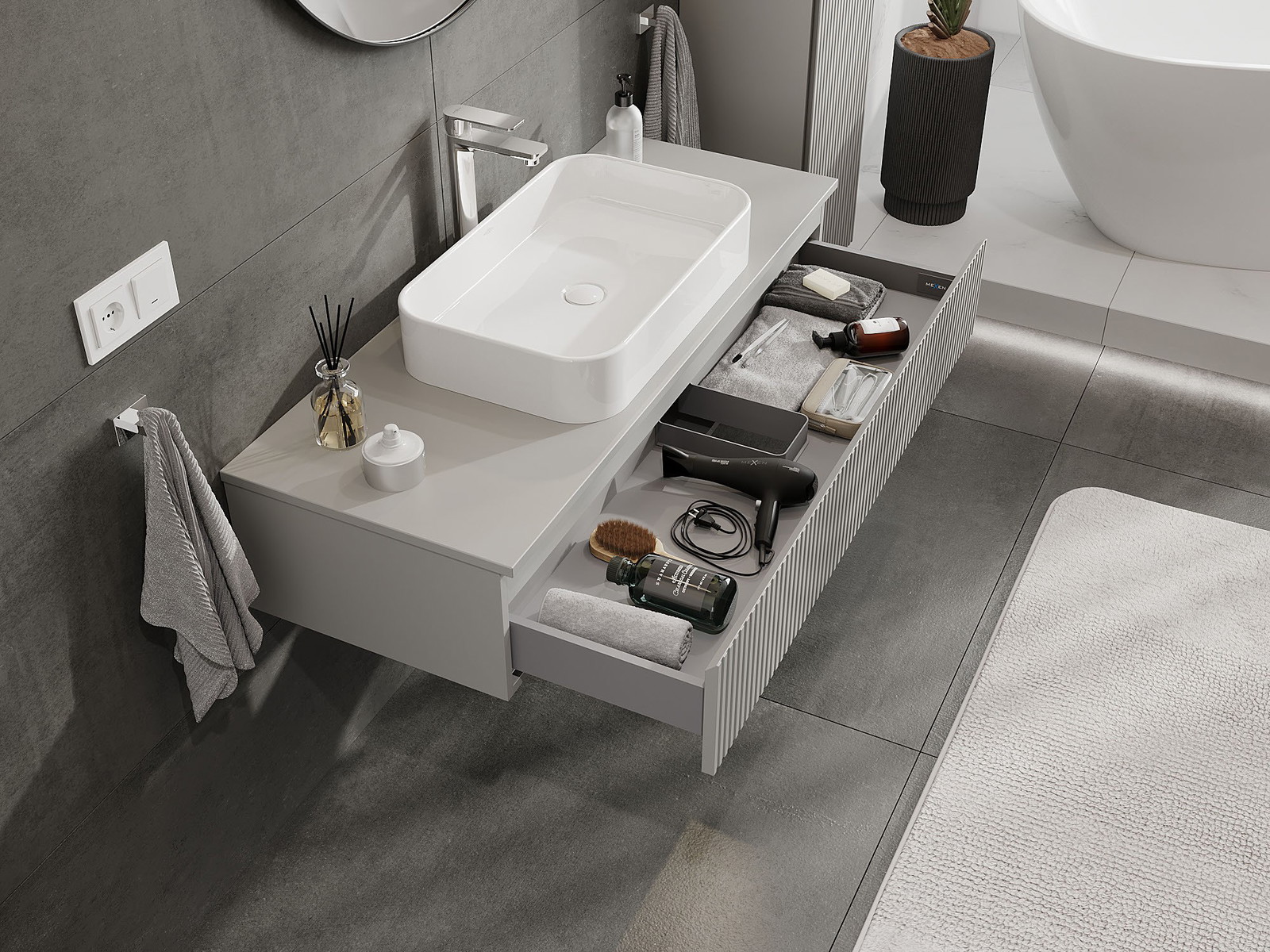 Mūsų moduliniai vonios baldai gali būti derinami tarpusavyje įvairiomis spalvų konfigūracijomis, leidžiant visiškai pritaikyti pagal asmeninius poreikius. Galima pasirinkti tiek atskirų elementų išvaizdą, tiek funkcijas, kas leidžia baldus pritaikyti pagal savo stiliaus ir naudojimo preferencijas.