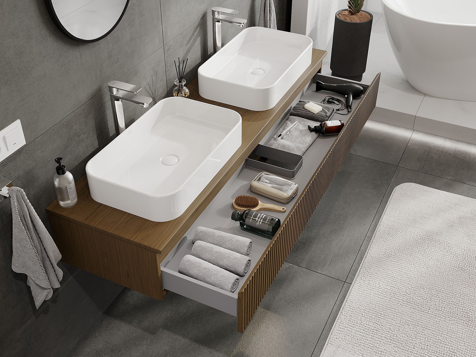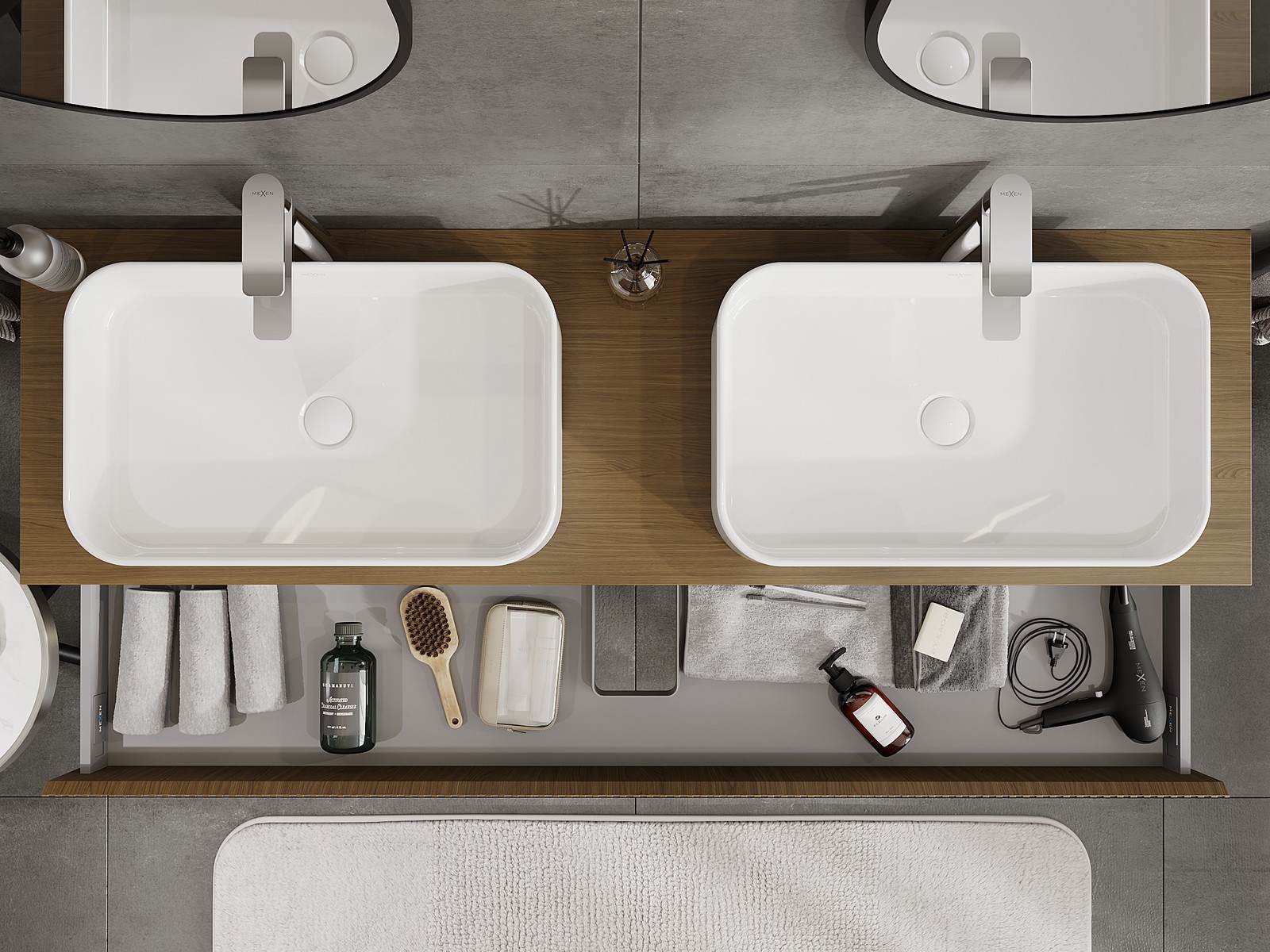 Mūsų moduliniai vonios baldai gali būti derinami tarpusavyje įvairiomis spalvų konfigūracijomis, leidžiant visiškai pritaikyti pagal asmeninius poreikius. Galima pasirinkti tiek atskirų elementų išvaizdą, tiek funkcijas, kas leidžia baldus pritaikyti pagal savo stiliaus ir naudojimo preferencijas.