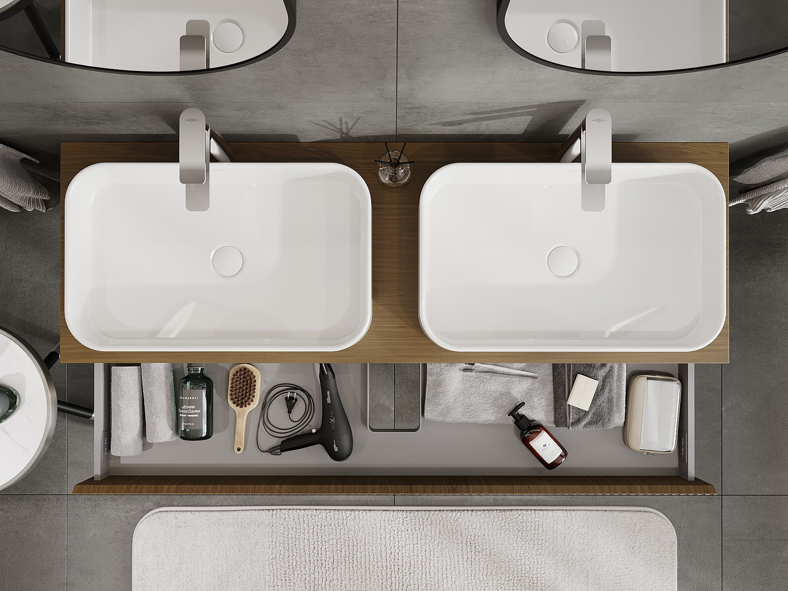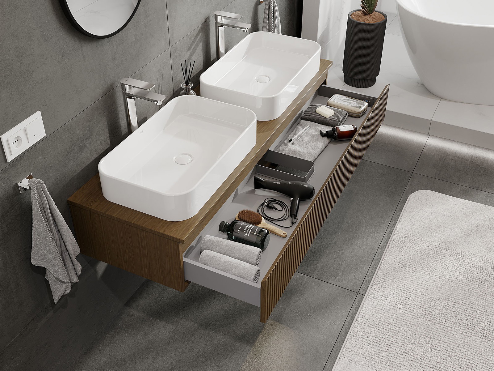 Mūsų moduliniai vonios baldai gali būti derinami tarpusavyje įvairiomis spalvų konfigūracijomis, leidžiant visiškai pritaikyti pagal asmeninius poreikius. Galima pasirinkti tiek atskirų elementų išvaizdą, tiek funkcijas, kas leidžia baldus pritaikyti pagal savo stiliaus ir naudojimo preferencijas.