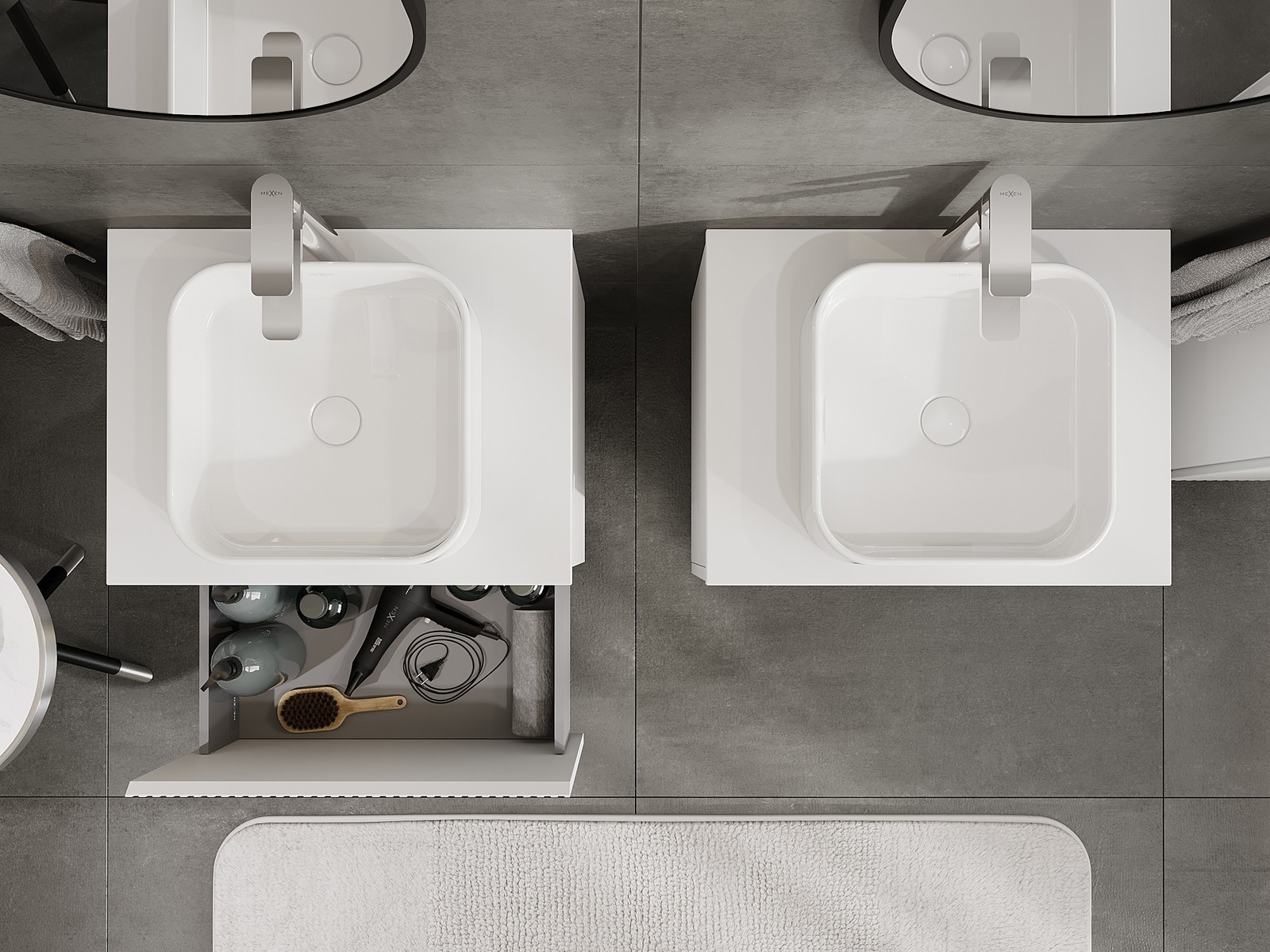 Mūsų moduliniai vonios baldai gali būti derinami tarpusavyje įvairiomis spalvų konfigūracijomis, leidžiant visiškai pritaikyti pagal asmeninius poreikius. Galima pasirinkti tiek atskirų elementų išvaizdą, tiek funkcijas, kas leidžia baldus pritaikyti pagal savo stiliaus ir naudojimo preferencijas.