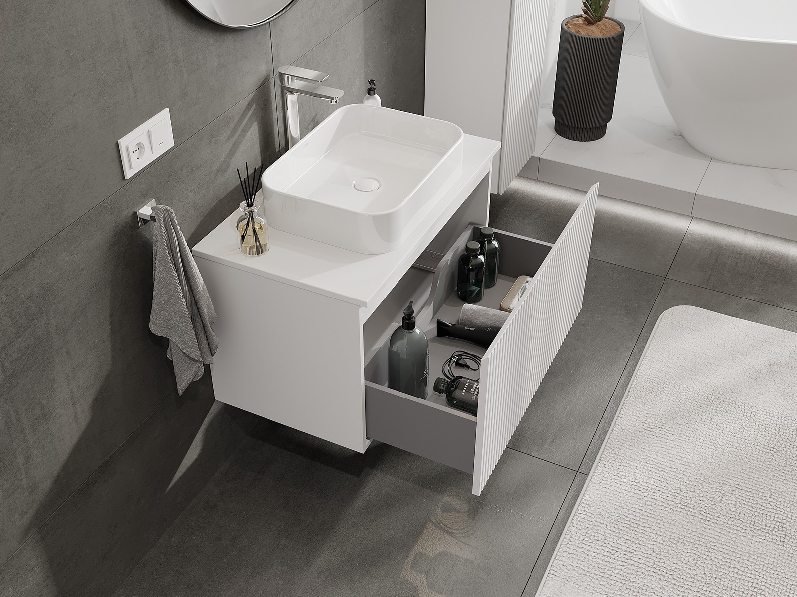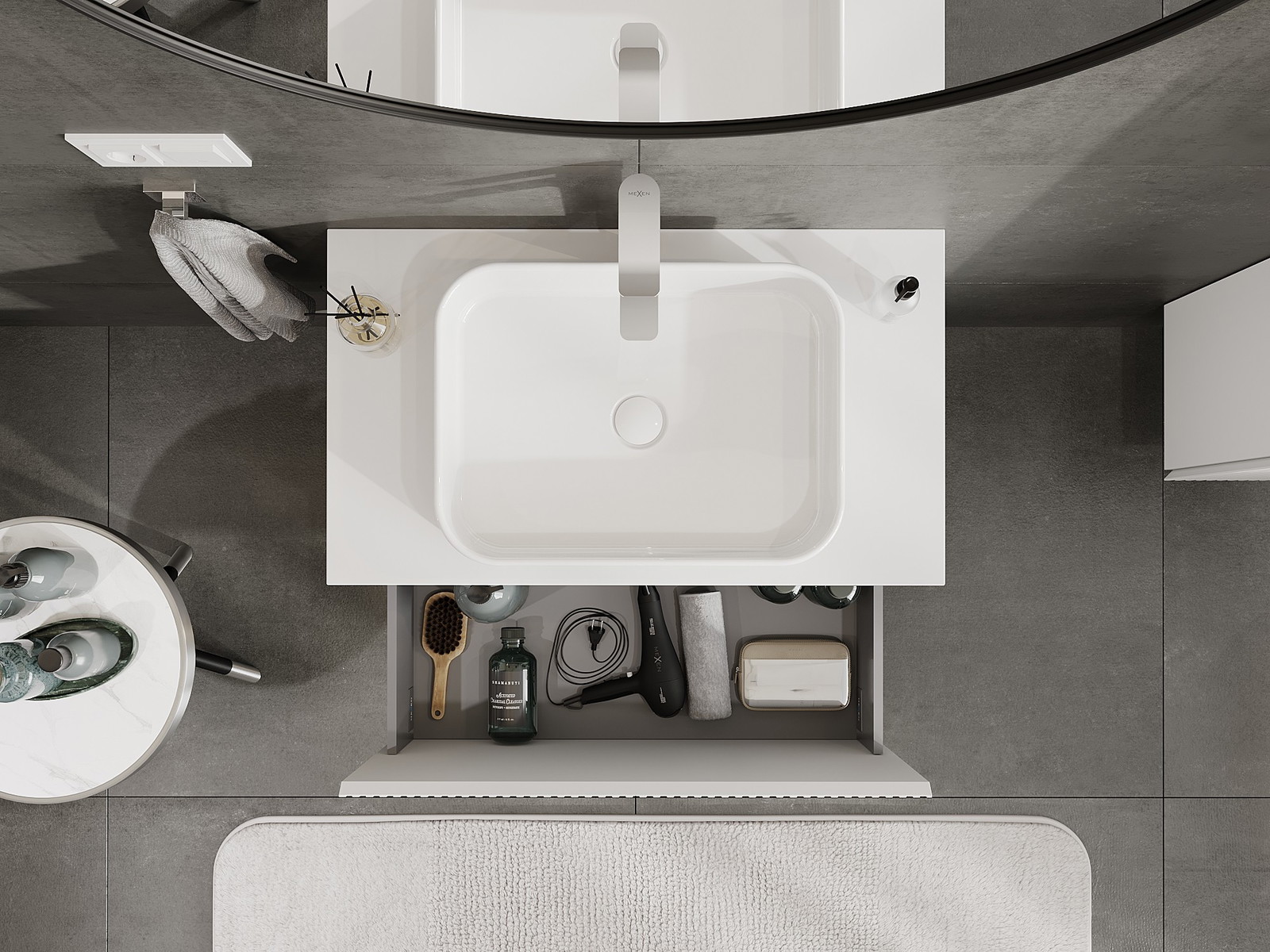 Mūsų moduliniai vonios baldai gali būti derinami tarpusavyje įvairiomis spalvų konfigūracijomis, leidžiant visiškai pritaikyti pagal asmeninius poreikius. Galima pasirinkti tiek atskirų elementų išvaizdą, tiek funkcijas, kas leidžia baldus pritaikyti pagal savo stiliaus ir naudojimo preferencijas.