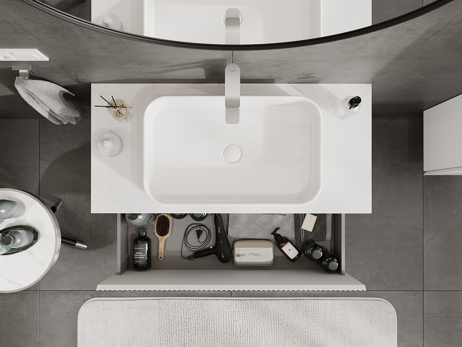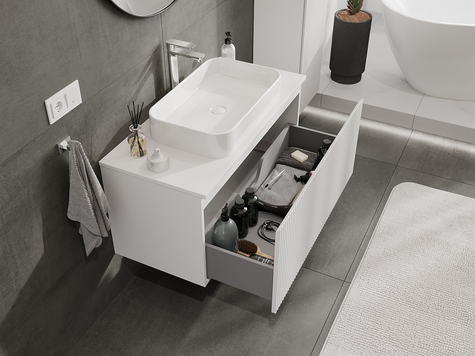 Mūsų moduliniai vonios baldai gali būti derinami tarpusavyje įvairiomis spalvų konfigūracijomis, leidžiant visiškai pritaikyti pagal asmeninius poreikius. Galima pasirinkti tiek atskirų elementų išvaizdą, tiek funkcijas, kas leidžia baldus pritaikyti pagal savo stiliaus ir naudojimo preferencijas.