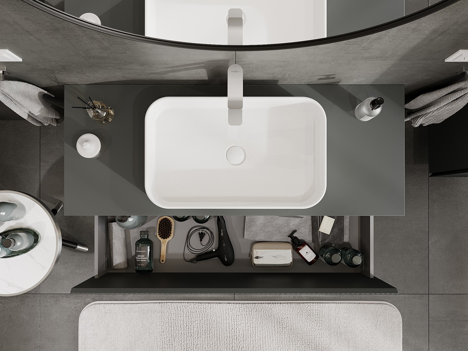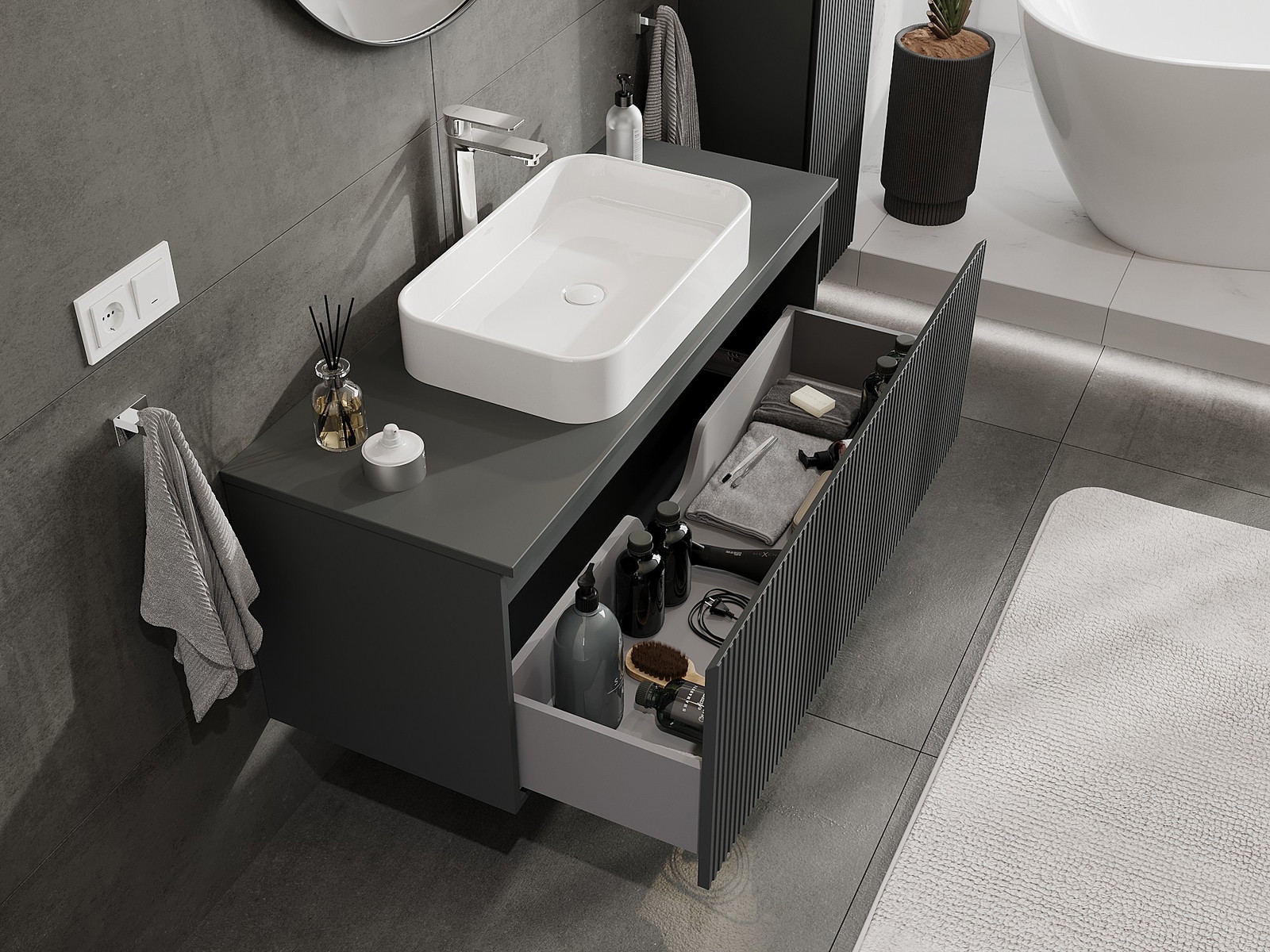 Mūsų moduliniai vonios baldai gali būti derinami tarpusavyje įvairiomis spalvų konfigūracijomis, leidžiant visiškai pritaikyti pagal asmeninius poreikius. Galima pasirinkti tiek atskirų elementų išvaizdą, tiek funkcijas, kas leidžia baldus pritaikyti pagal savo stiliaus ir naudojimo preferencijas.