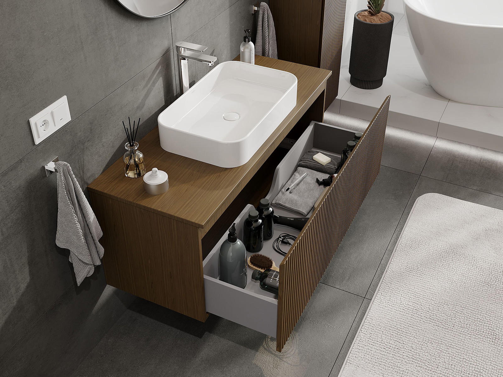 Mūsų moduliniai vonios baldai gali būti derinami tarpusavyje įvairiomis spalvų konfigūracijomis, leidžiant visiškai pritaikyti pagal asmeninius poreikius. Galima pasirinkti tiek atskirų elementų išvaizdą, tiek funkcijas, kas leidžia baldus pritaikyti pagal savo stiliaus ir naudojimo preferencijas.
