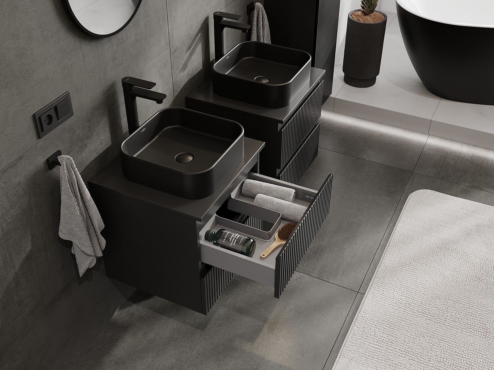 Mūsų moduliniai vonios baldai gali būti derinami tarpusavyje įvairiomis spalvų konfigūracijomis, leidžiant visiškai pritaikyti pagal asmeninius poreikius. Galima pasirinkti tiek atskirų elementų išvaizdą, tiek funkcijas, kas leidžia baldus pritaikyti pagal savo stiliaus ir naudojimo preferencijas.