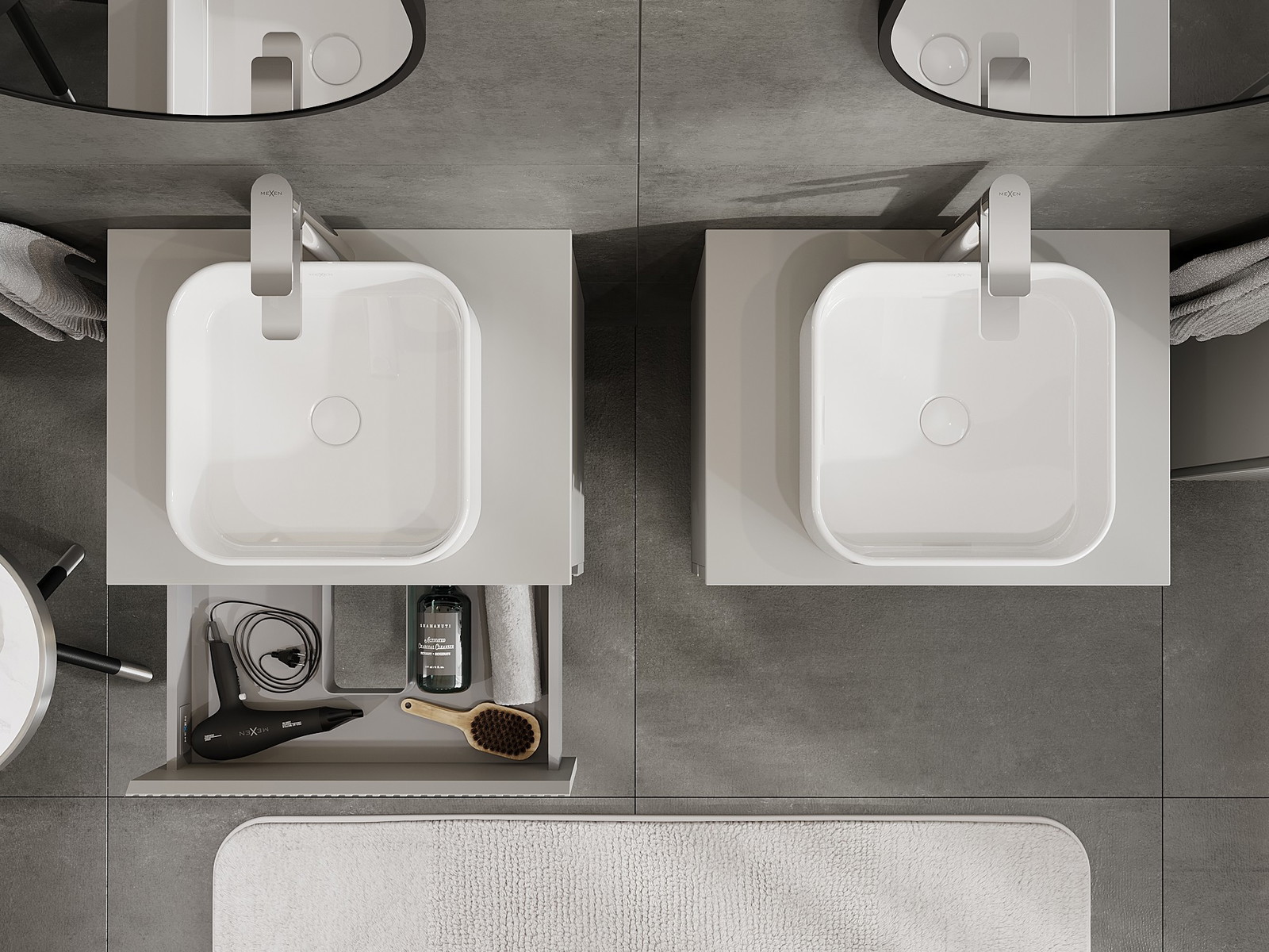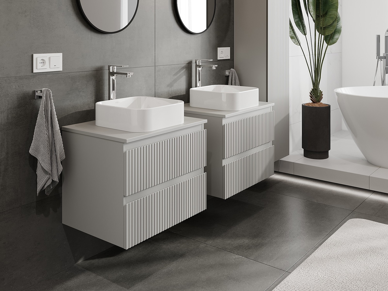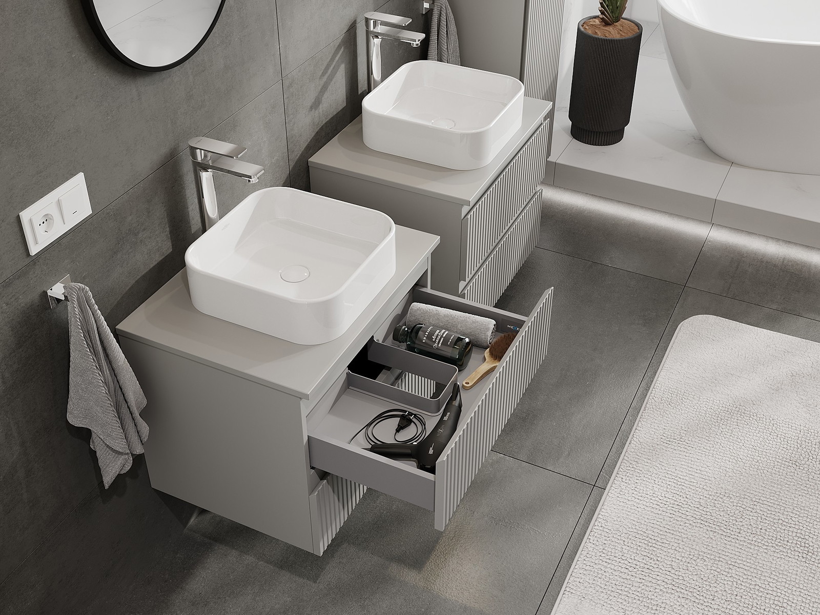 Mūsų moduliniai vonios baldai gali būti derinami tarpusavyje įvairiomis spalvų konfigūracijomis, leidžiant visiškai pritaikyti pagal asmeninius poreikius. Galima pasirinkti tiek atskirų elementų išvaizdą, tiek funkcijas, kas leidžia baldus pritaikyti pagal savo stiliaus ir naudojimo preferencijas.