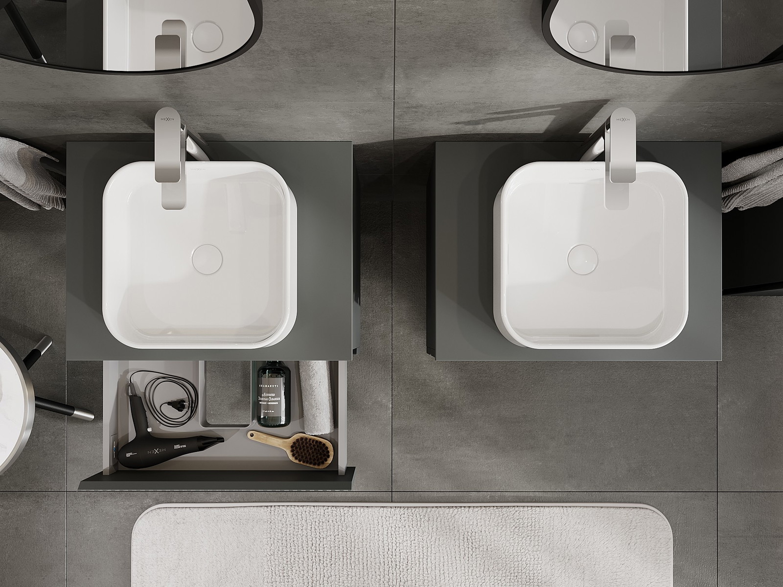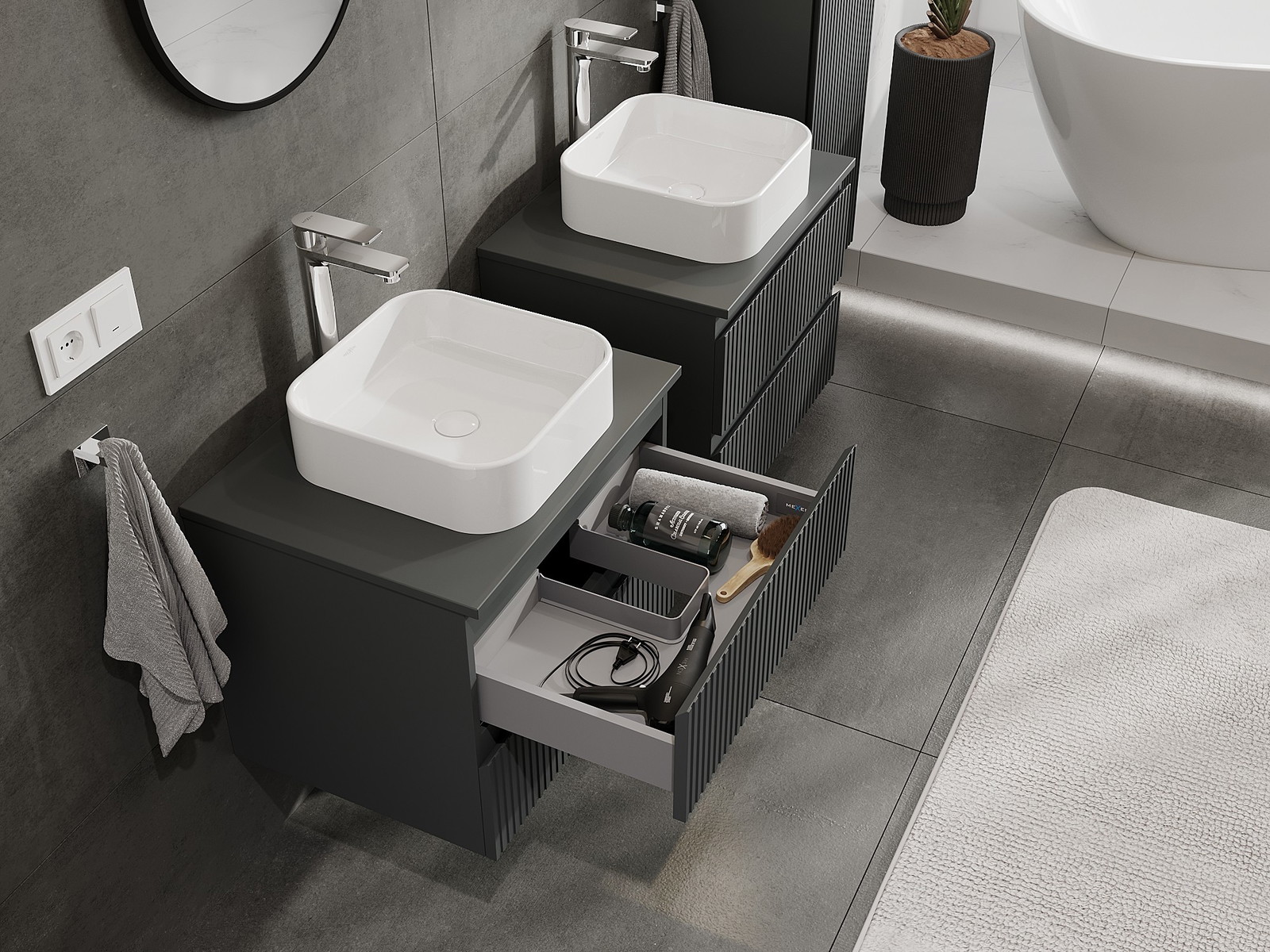 Mūsų moduliniai vonios baldai gali būti derinami tarpusavyje įvairiomis spalvų konfigūracijomis, leidžiant visiškai pritaikyti pagal asmeninius poreikius. Galima pasirinkti tiek atskirų elementų išvaizdą, tiek funkcijas, kas leidžia baldus pritaikyti pagal savo stiliaus ir naudojimo preferencijas.