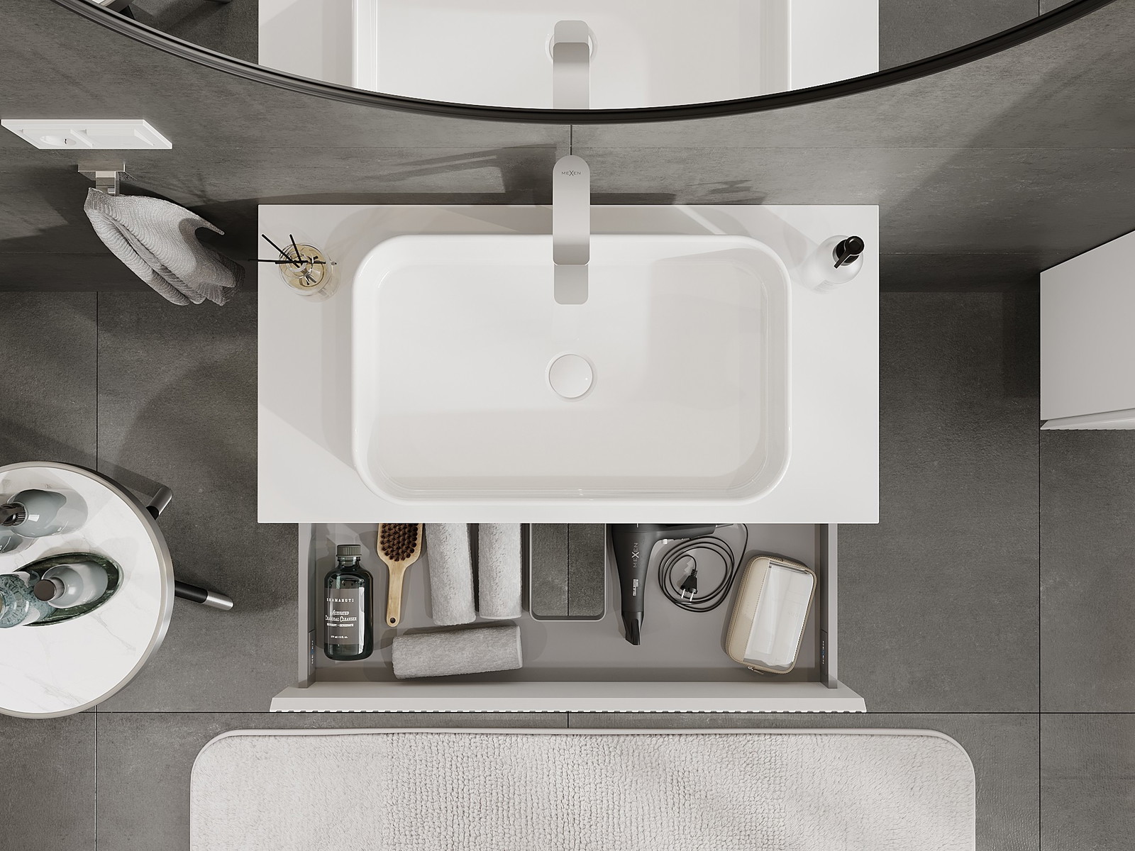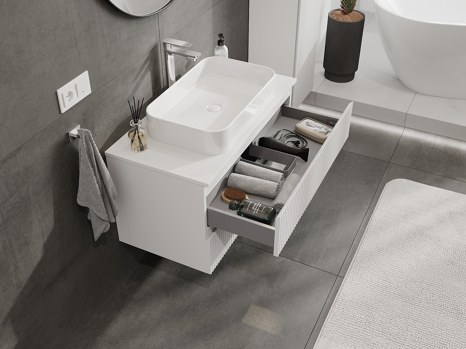 Mūsų moduliniai vonios baldai gali būti derinami tarpusavyje įvairiomis spalvų konfigūracijomis, leidžiant visiškai pritaikyti pagal asmeninius poreikius. Galima pasirinkti tiek atskirų elementų išvaizdą, tiek funkcijas, kas leidžia baldus pritaikyti pagal savo stiliaus ir naudojimo preferencijas.