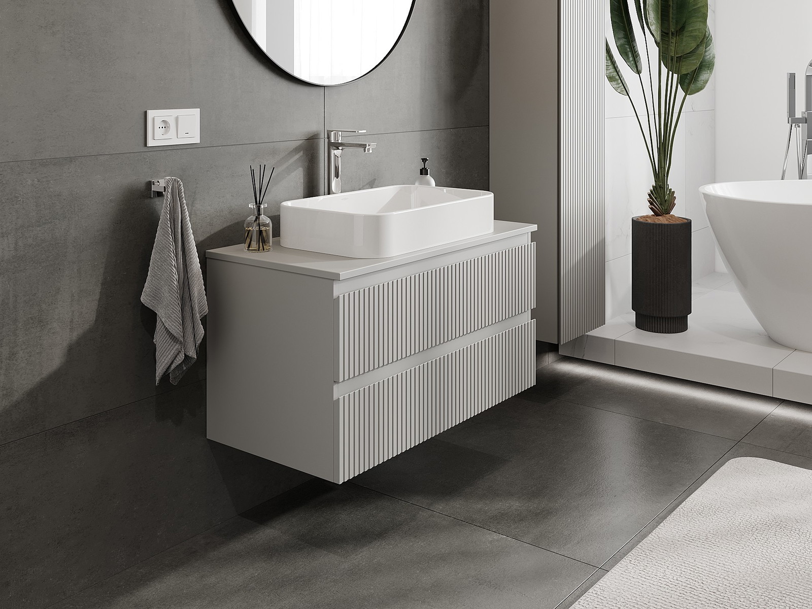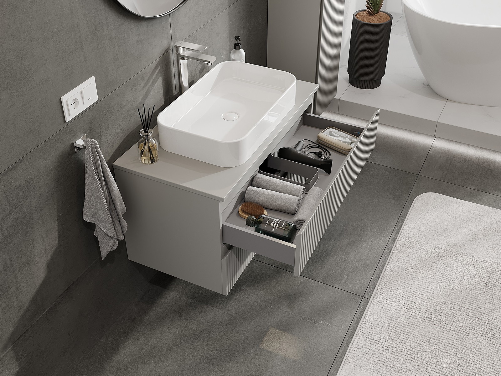 Mūsų moduliniai vonios baldai gali būti derinami tarpusavyje įvairiomis spalvų konfigūracijomis, leidžiant visiškai pritaikyti pagal asmeninius poreikius. Galima pasirinkti tiek atskirų elementų išvaizdą, tiek funkcijas, kas leidžia baldus pritaikyti pagal savo stiliaus ir naudojimo preferencijas.