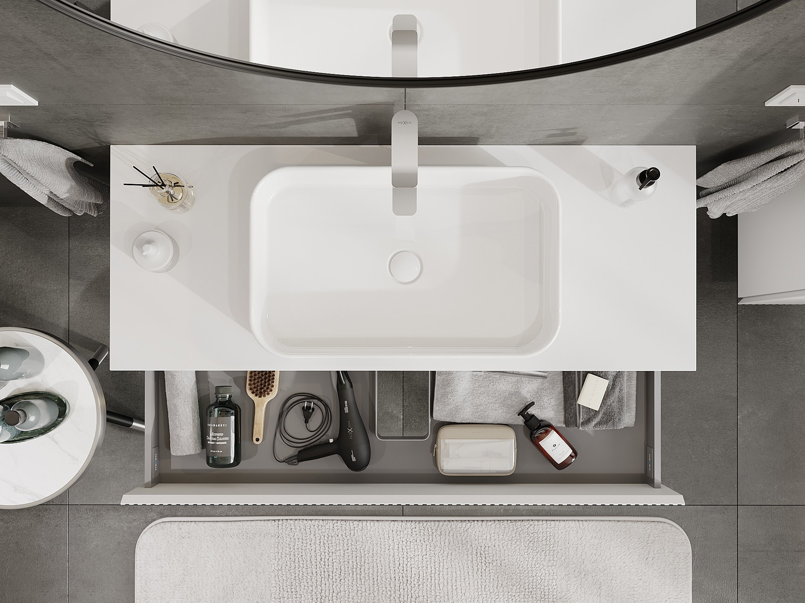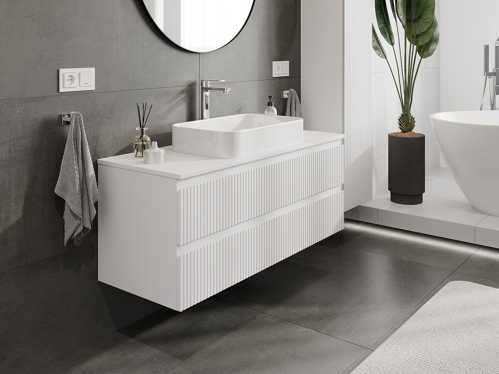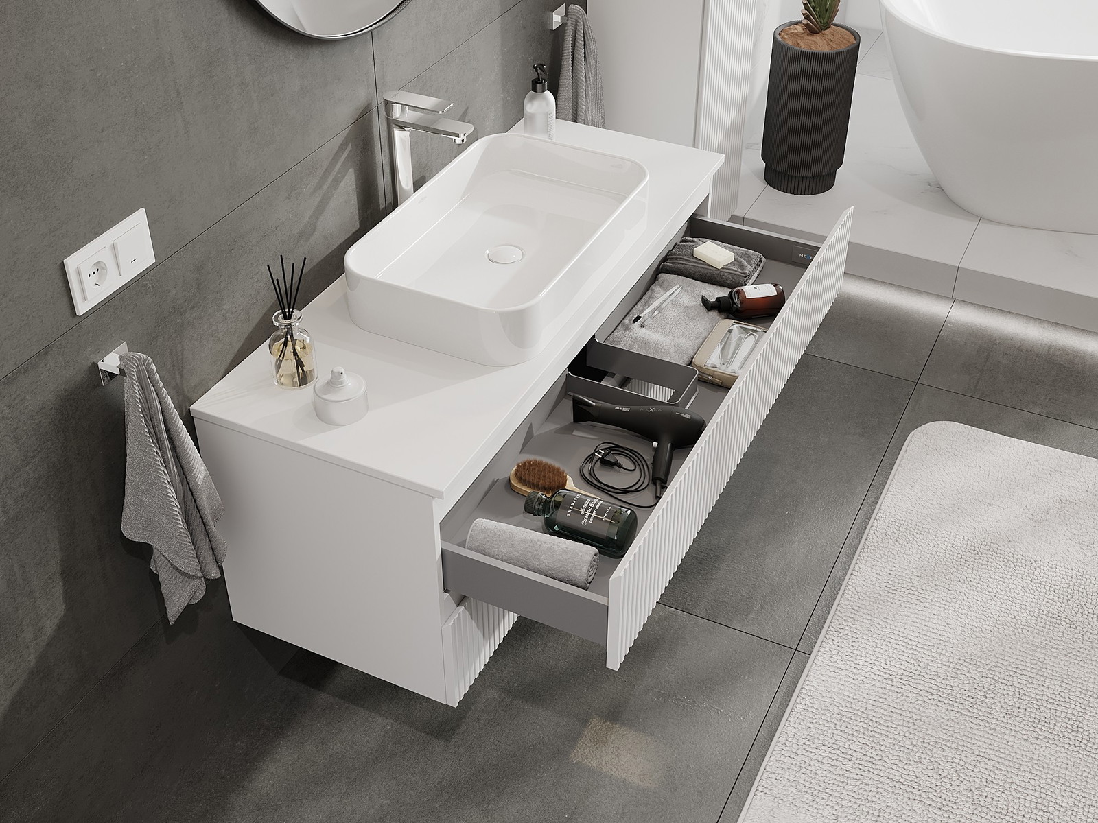 Mūsų moduliniai vonios baldai gali būti derinami tarpusavyje įvairiomis spalvų konfigūracijomis, leidžiant visiškai pritaikyti pagal asmeninius poreikius. Galima pasirinkti tiek atskirų elementų išvaizdą, tiek funkcijas, kas leidžia baldus pritaikyti pagal savo stiliaus ir naudojimo preferencijas.