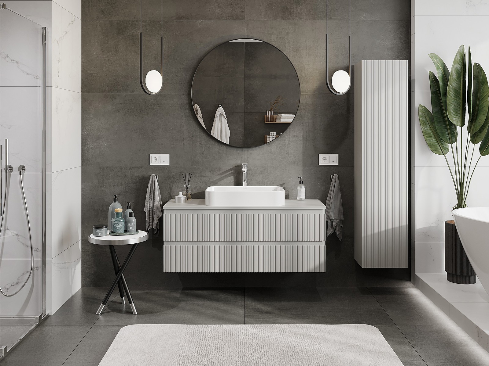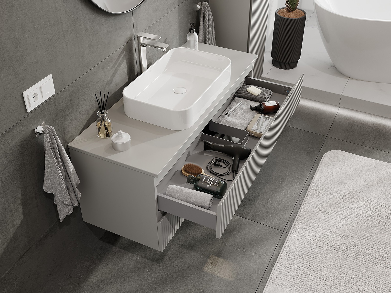 Mūsų moduliniai vonios baldai gali būti derinami tarpusavyje įvairiomis spalvų konfigūracijomis, leidžiant visiškai pritaikyti pagal asmeninius poreikius. Galima pasirinkti tiek atskirų elementų išvaizdą, tiek funkcijas, kas leidžia baldus pritaikyti pagal savo stiliaus ir naudojimo preferencijas.