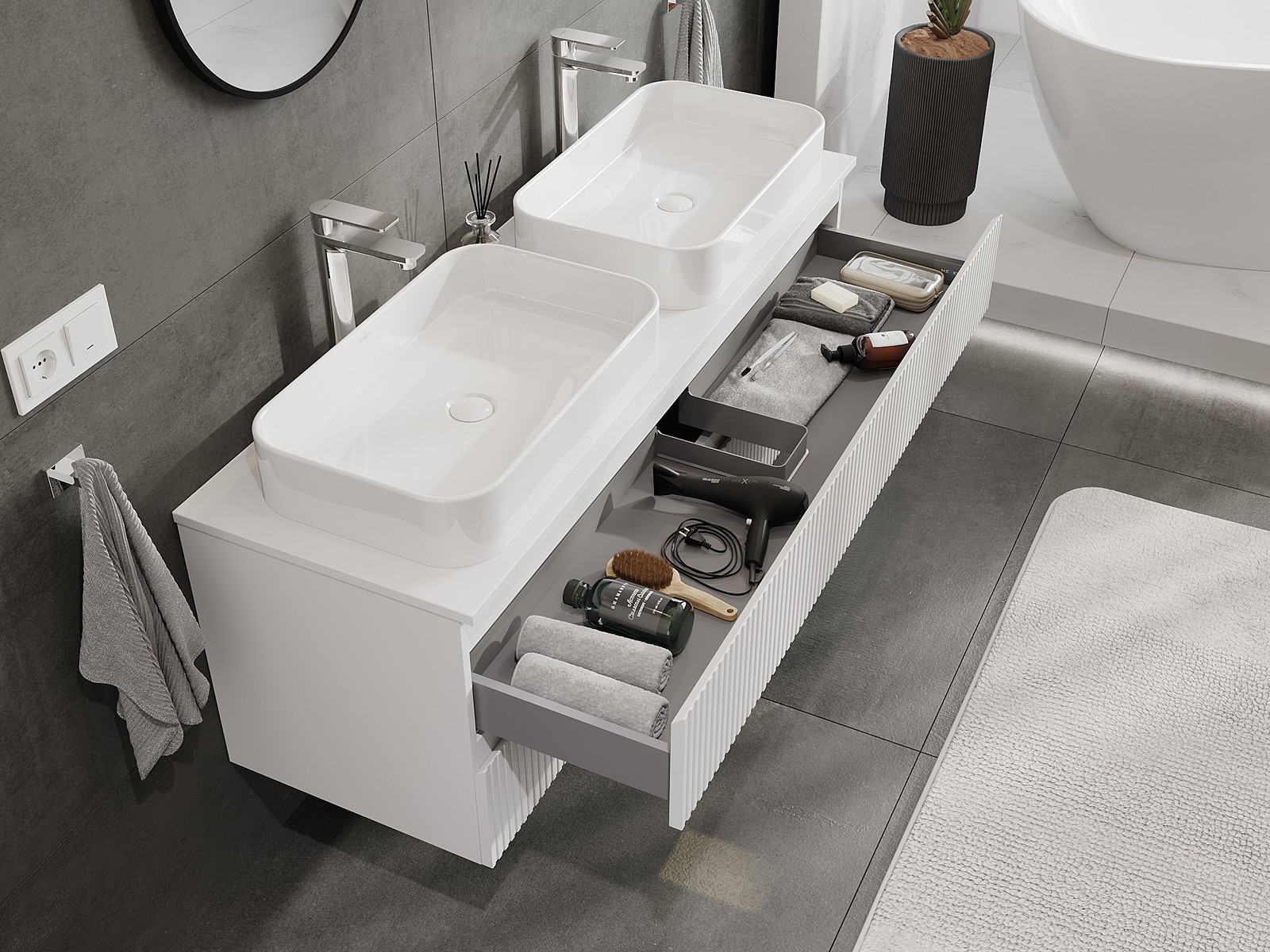 Mūsų moduliniai vonios baldai gali būti derinami tarpusavyje įvairiomis spalvų konfigūracijomis, leidžiant visiškai pritaikyti pagal asmeninius poreikius. Galima pasirinkti tiek atskirų elementų išvaizdą, tiek funkcijas, kas leidžia baldus pritaikyti pagal savo stiliaus ir naudojimo preferencijas.