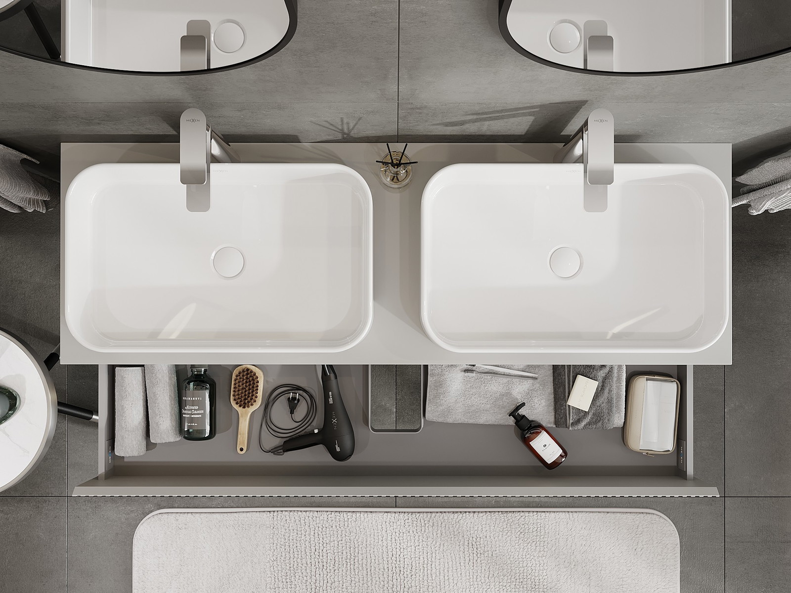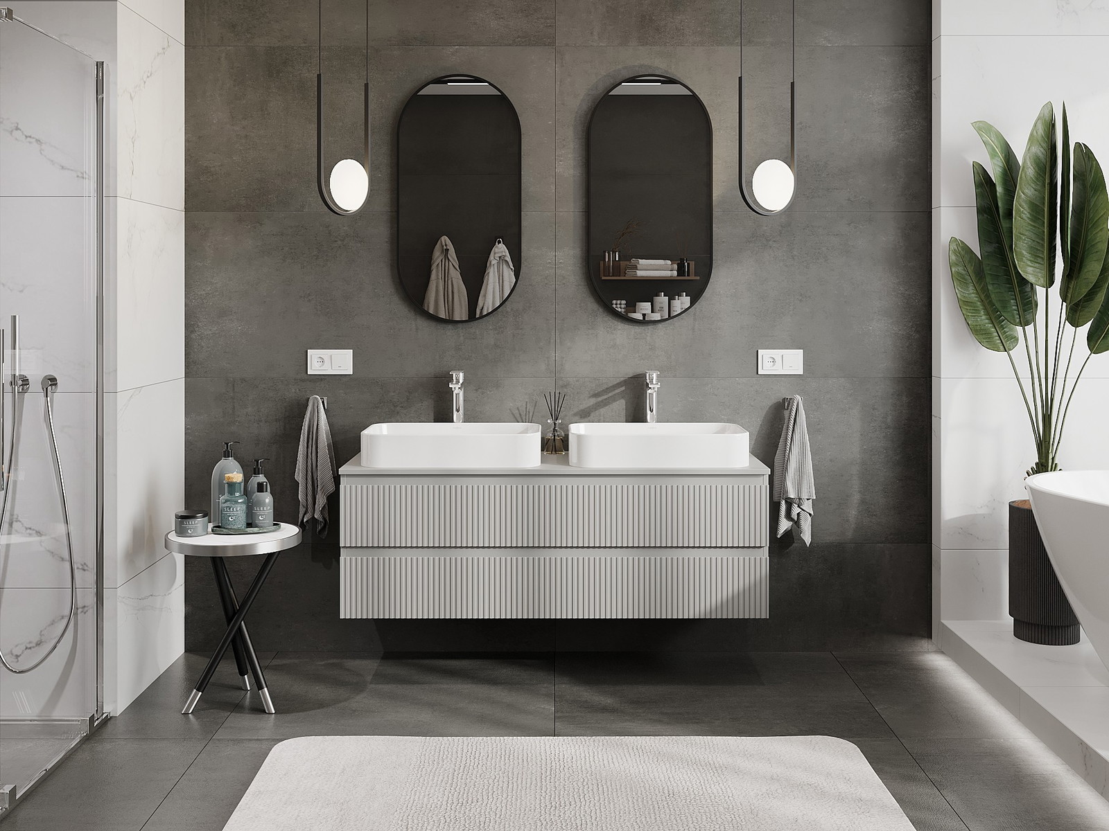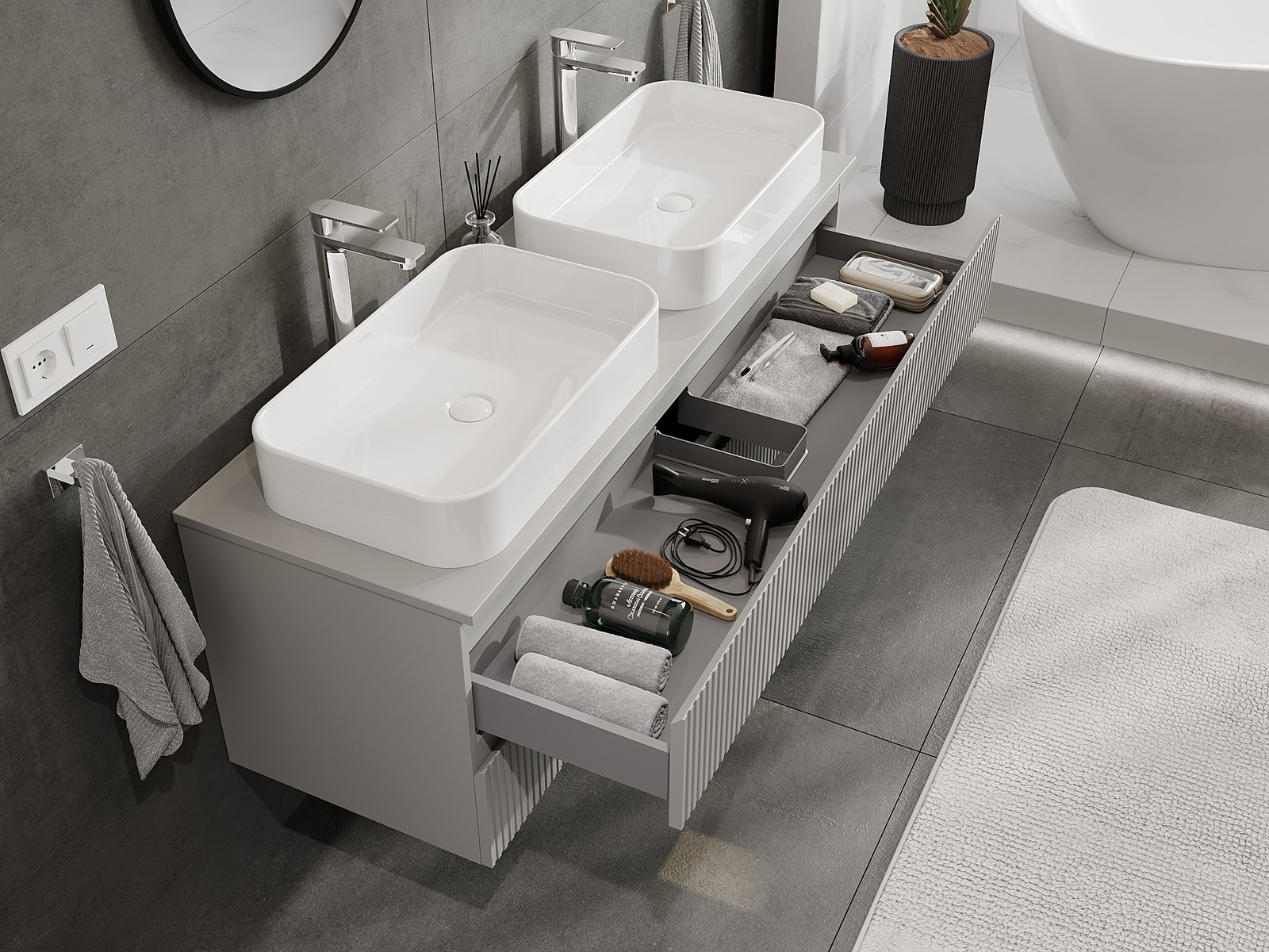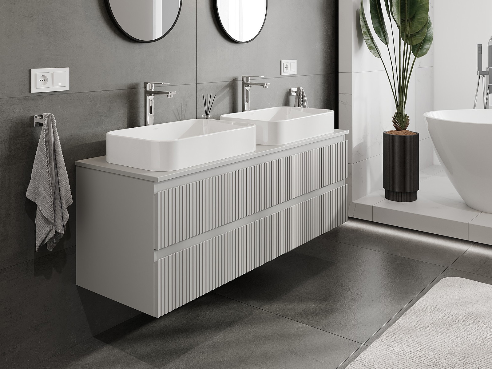 Mūsų moduliniai vonios baldai gali būti derinami tarpusavyje įvairiomis spalvų konfigūracijomis, leidžiant visiškai pritaikyti pagal asmeninius poreikius. Galima pasirinkti tiek atskirų elementų išvaizdą, tiek funkcijas, kas leidžia baldus pritaikyti pagal savo stiliaus ir naudojimo preferencijas.
