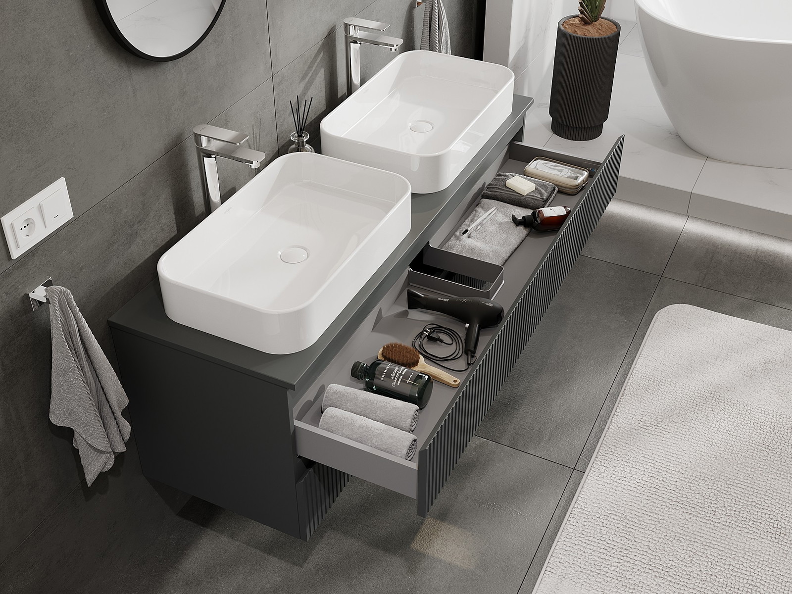 Mūsų moduliniai vonios baldai gali būti derinami tarpusavyje įvairiomis spalvų konfigūracijomis, leidžiant visiškai pritaikyti pagal asmeninius poreikius. Galima pasirinkti tiek atskirų elementų išvaizdą, tiek funkcijas, kas leidžia baldus pritaikyti pagal savo stiliaus ir naudojimo preferencijas.