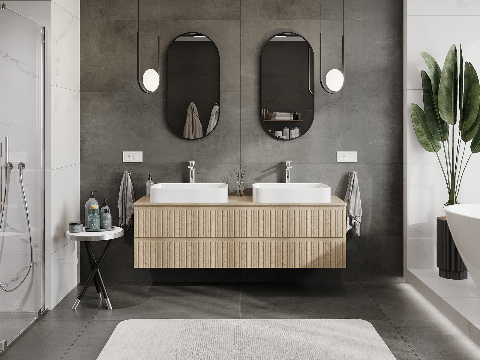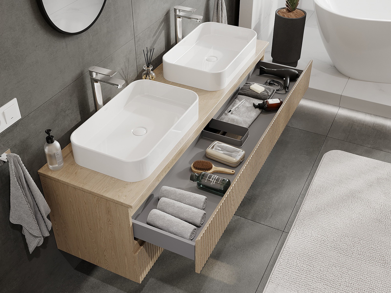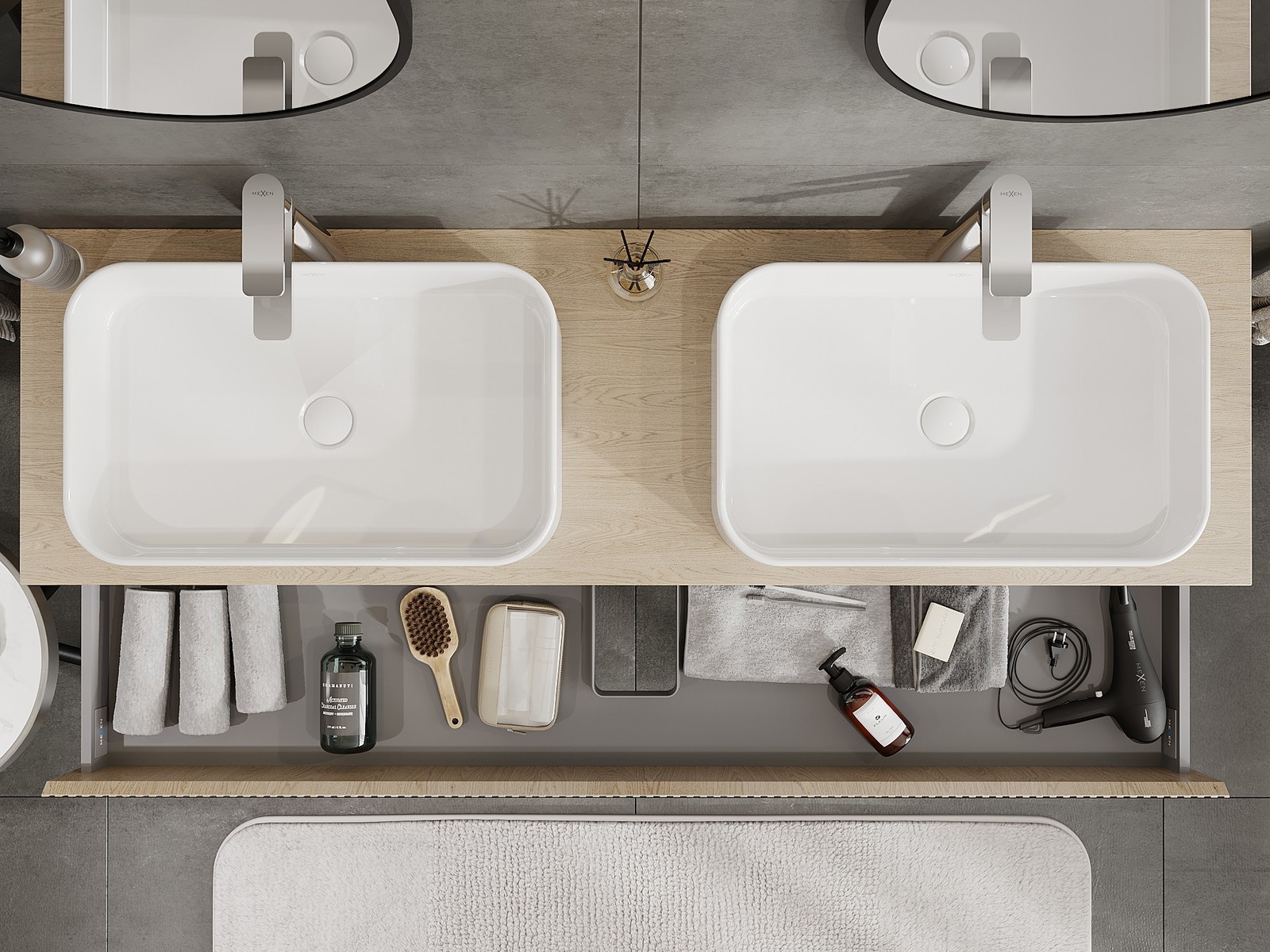 Mūsų moduliniai vonios baldai gali būti derinami tarpusavyje įvairiomis spalvų konfigūracijomis, leidžiant visiškai pritaikyti pagal asmeninius poreikius. Galima pasirinkti tiek atskirų elementų išvaizdą, tiek funkcijas, kas leidžia baldus pritaikyti pagal savo stiliaus ir naudojimo preferencijas.
