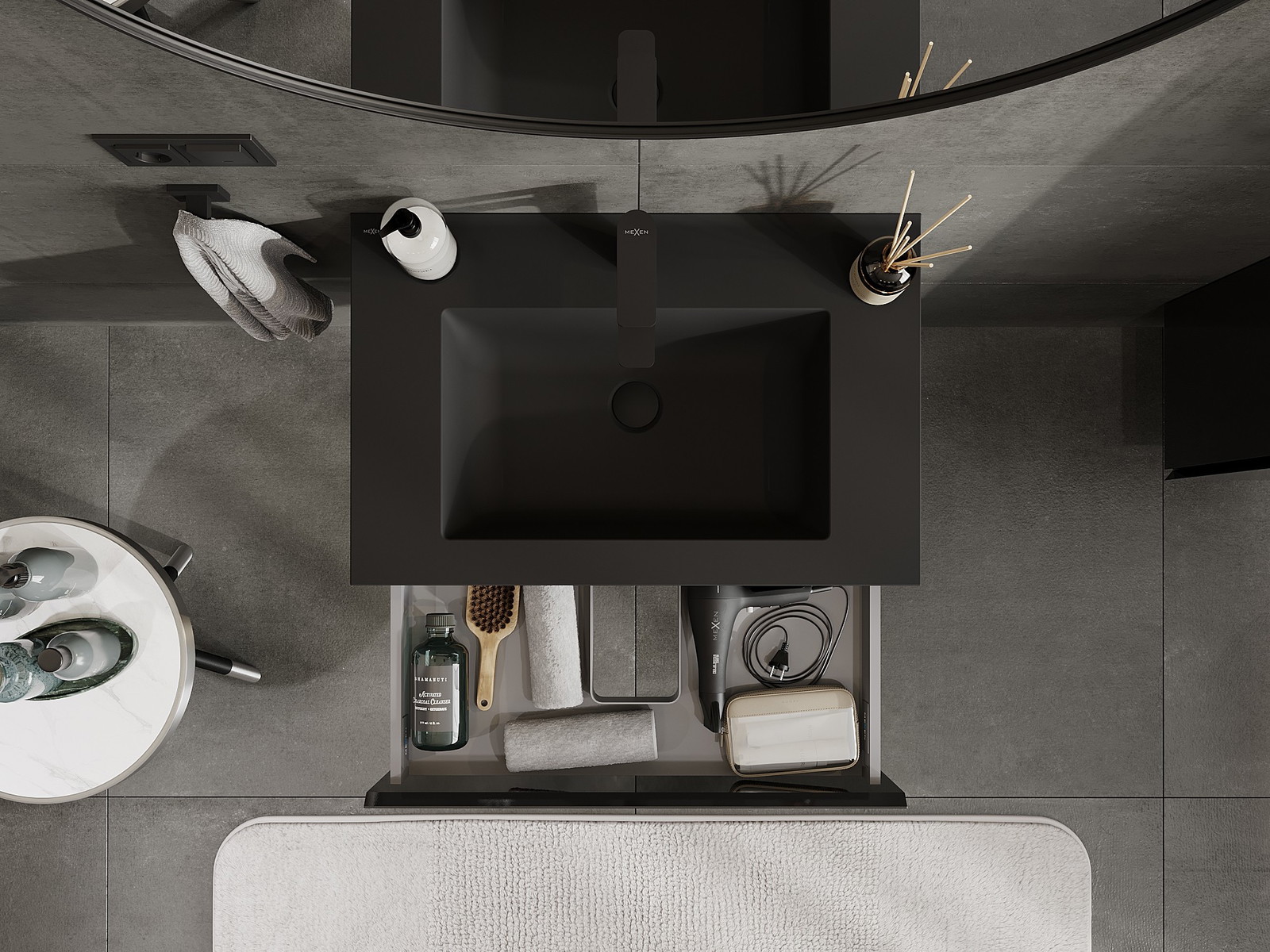 Mexen Orio vonios spintelė 70 cm su Otis praustuvu, 1 stalčius, juodas blizgesys/juodas matas - 91A10-07023-1-BF70-W18M71