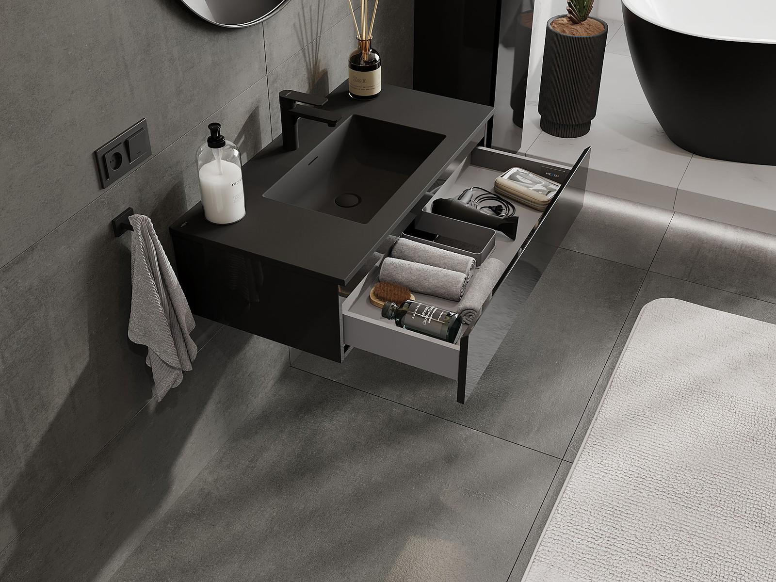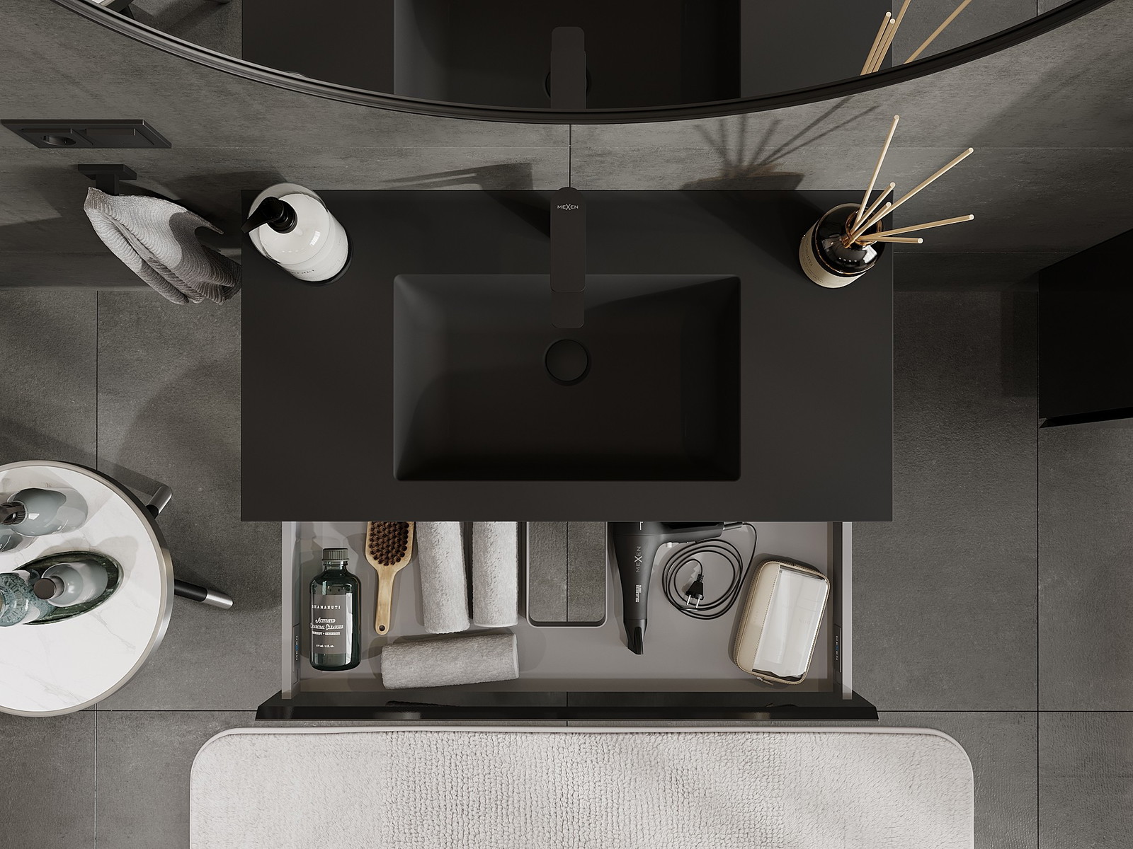 Mexen Orio vonios spintelė 90 cm su praustuvu Otis, 1 stalčius, juoda blizgi/juoda matinė - 91A10-09023-1-BF70-W18M71