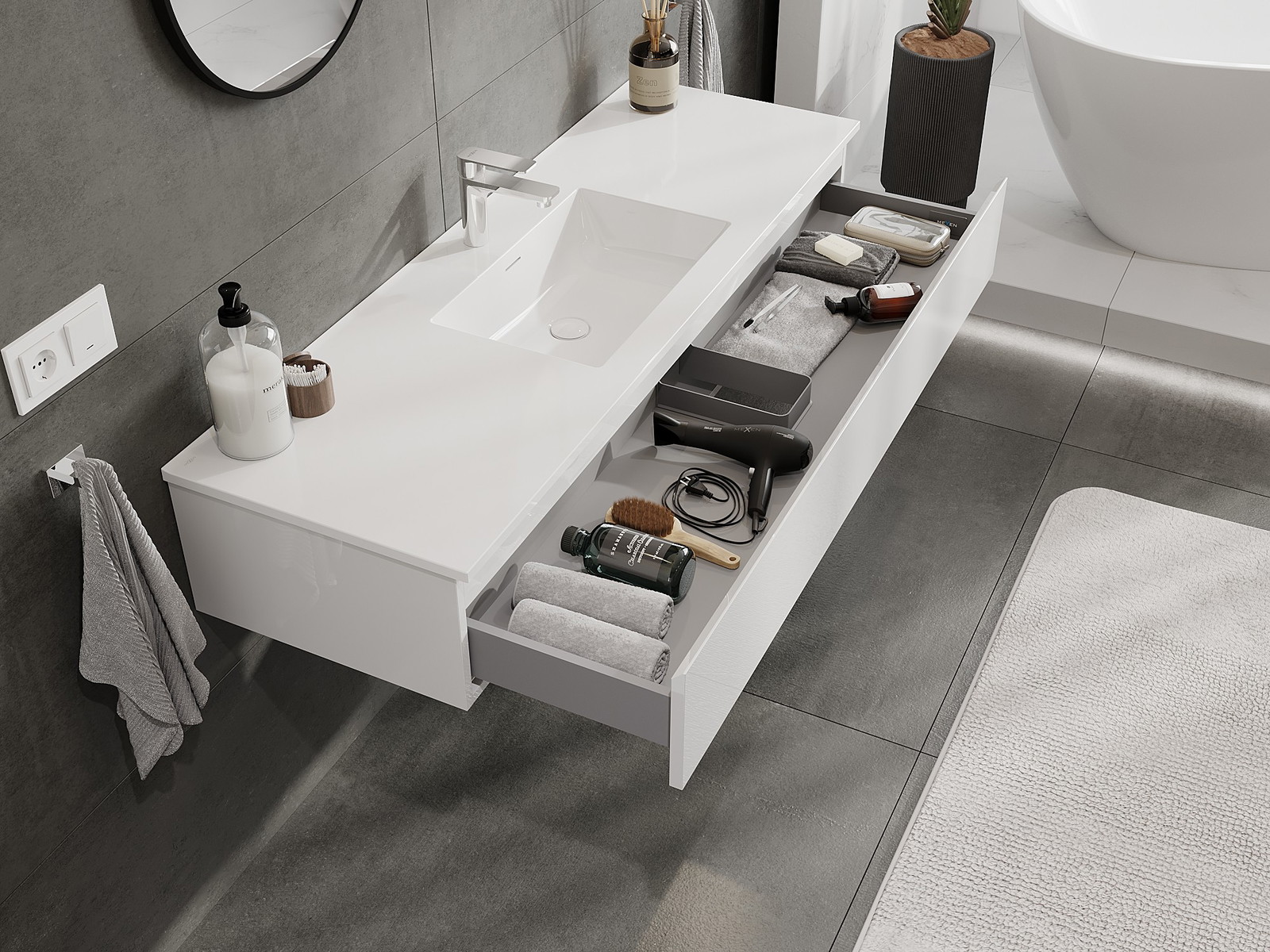 Mūsų moduliniai vonios baldai gali būti derinami tarpusavyje įvairiomis spalvų konfigūracijomis, leidžiant visiškai pritaikyti pagal asmeninius poreikius. Galima pasirinkti tiek atskirų elementų išvaizdą, tiek funkcijas, kas leidžia baldus pritaikyti pagal savo stiliaus ir naudojimo preferencijas.