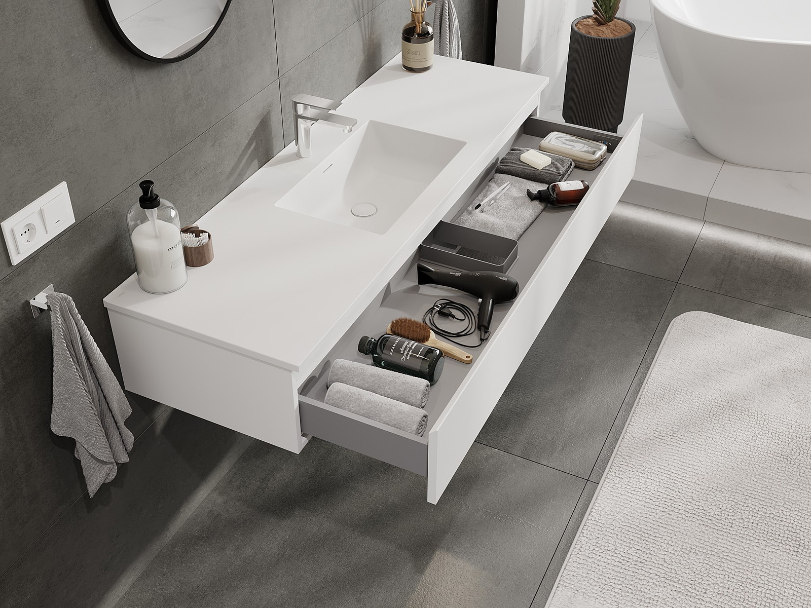 Mūsų moduliniai vonios baldai gali būti derinami tarpusavyje įvairiomis spalvų konfigūracijomis, leidžiant visiškai pritaikyti pagal asmeninius poreikius. Galima pasirinkti tiek atskirų elementų išvaizdą, tiek funkcijas, kas leidžia baldus pritaikyti pagal savo stiliaus ir naudojimo preferencijas.