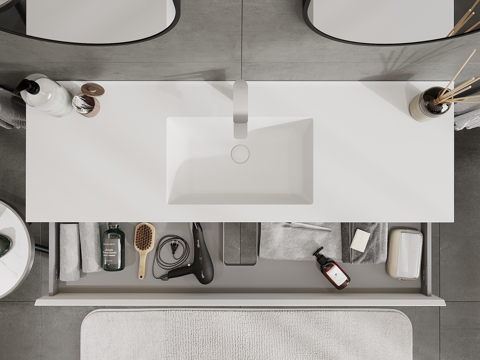 Mexen Orio vonios spintelė 140 cm su praustuvu Otis, 1 stalčius, balta matinė - 91A10-14023-1-BF01-W18M01