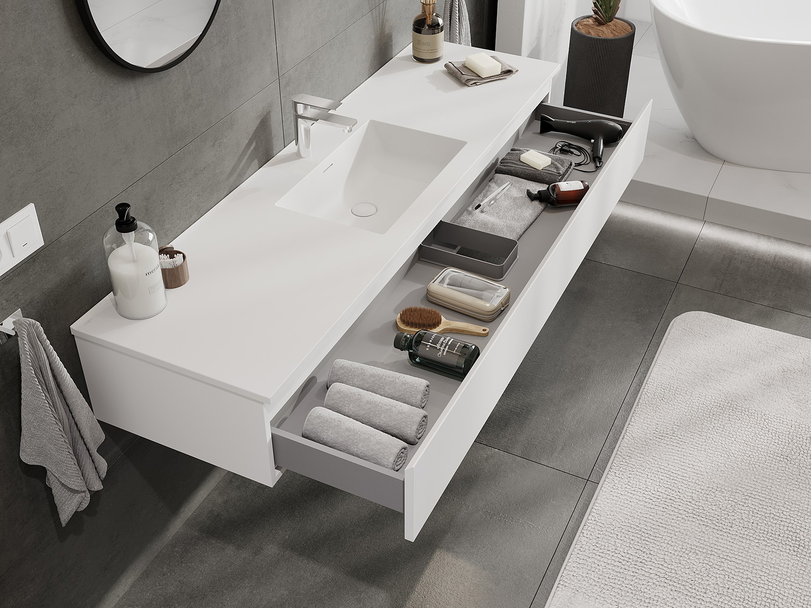 Mūsų moduliniai vonios baldai gali būti derinami tarpusavyje įvairiomis spalvų konfigūracijomis, leidžiant visiškai pritaikyti pagal asmeninius poreikius. Galima pasirinkti tiek atskirų elementų išvaizdą, tiek funkcijas, kas leidžia baldus pritaikyti pagal savo stiliaus ir naudojimo preferencijas.
