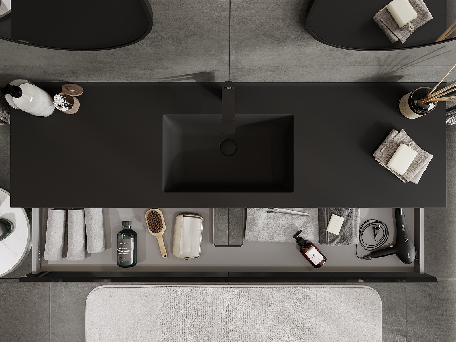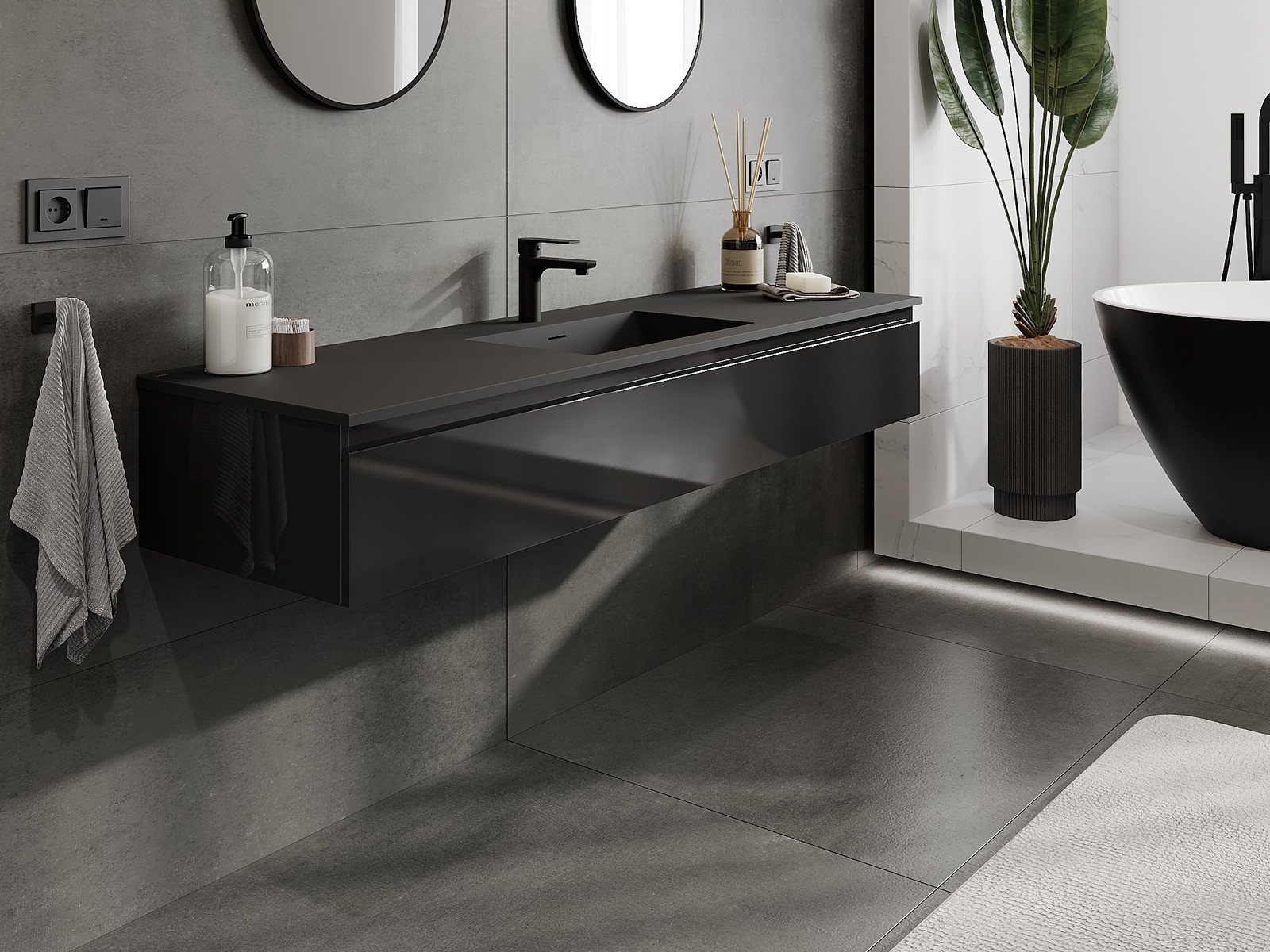 Mexen Orio vonios spintelė 160 cm su Otis praustuvu, 1 stalčius, juodas blizgesys/juodas matinis - 91A10-16023-1-BF70-W18M71