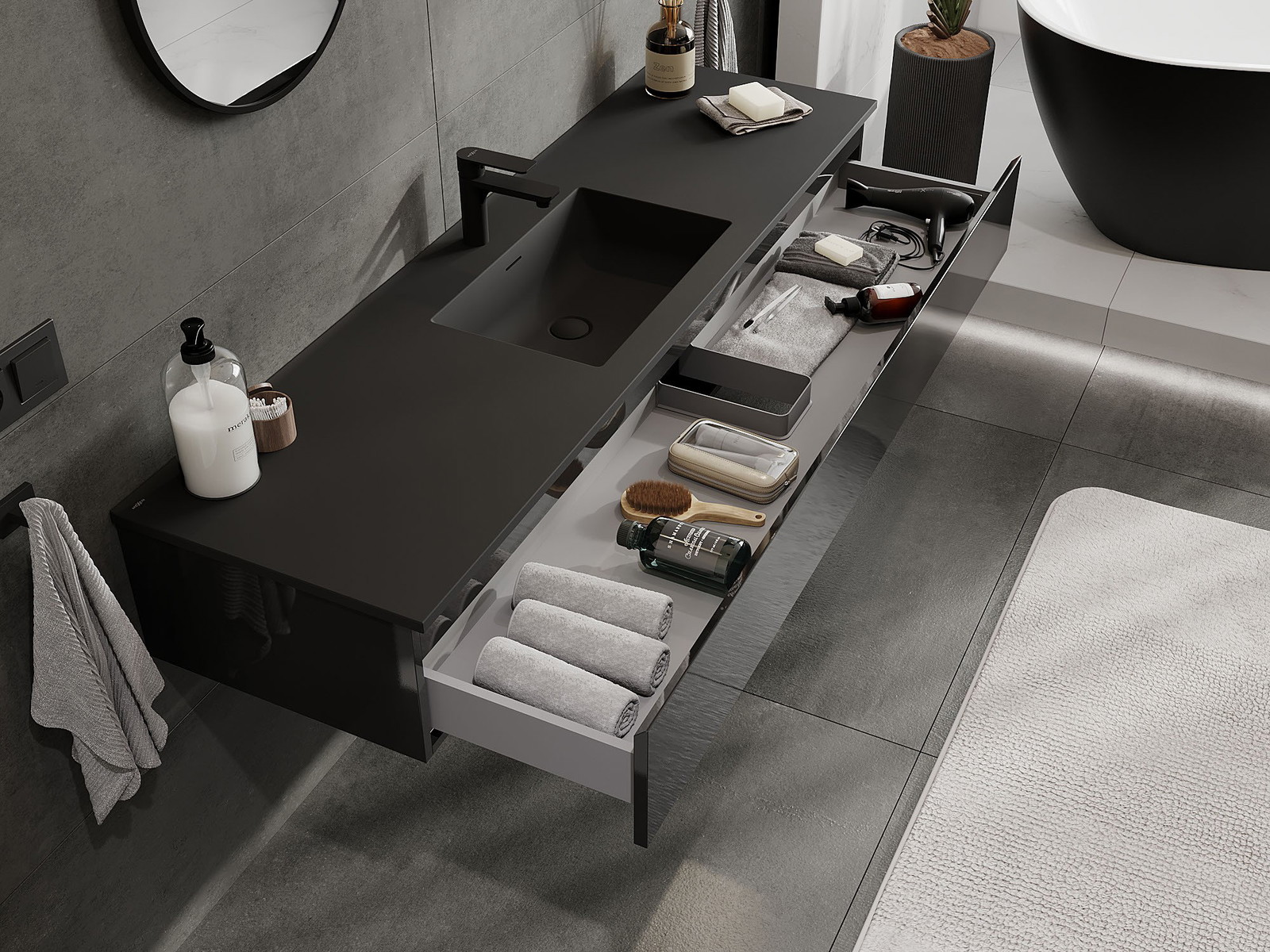 Mūsų moduliniai vonios baldai gali būti derinami tarpusavyje įvairiomis spalvų konfigūracijomis, leidžiant visiškai pritaikyti pagal asmeninius poreikius. Galima pasirinkti tiek atskirų elementų išvaizdą, tiek funkcijas, kas leidžia baldus pritaikyti pagal savo stiliaus ir naudojimo preferencijas.