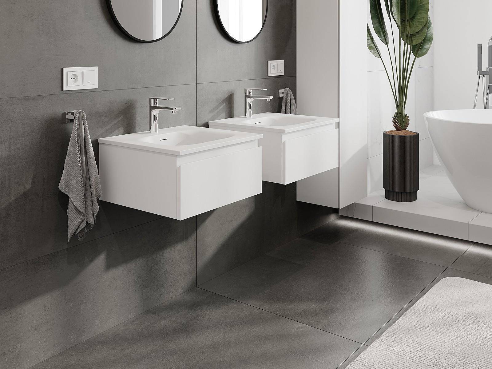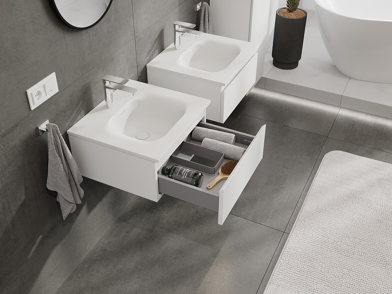 Mūsų moduliniai vonios baldai gali būti derinami tarpusavyje įvairiomis spalvų konfigūracijomis, leidžiant visiškai pritaikyti pagal asmeninius poreikius. Galima pasirinkti tiek atskirų elementų išvaizdą, tiek funkcijas, kas leidžia baldus pritaikyti pagal savo stiliaus ir naudojimo preferencijas.