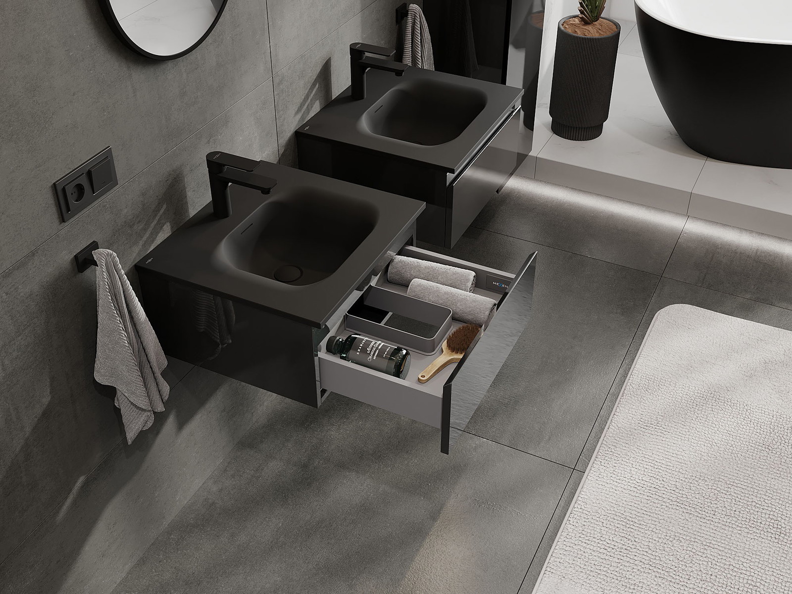 Mūsų moduliniai vonios baldai gali būti derinami tarpusavyje įvairiomis spalvų konfigūracijomis, leidžiant visiškai pritaikyti pagal asmeninius poreikius. Galima pasirinkti tiek atskirų elementų išvaizdą, tiek funkcijas, kas leidžia baldus pritaikyti pagal savo stiliaus ir naudojimo preferencijas.