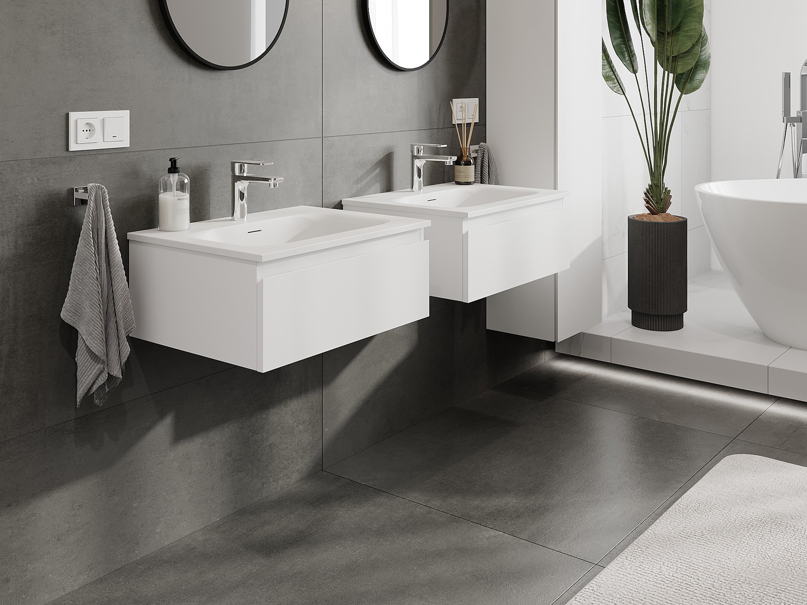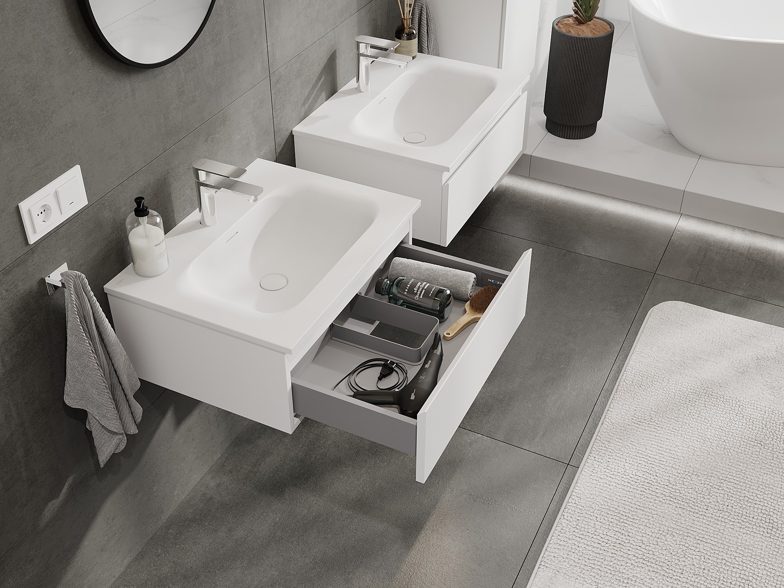 Mūsų moduliniai vonios baldai gali būti derinami tarpusavyje įvairiomis spalvų konfigūracijomis, leidžiant visiškai pritaikyti pagal asmeninius poreikius. Galima pasirinkti tiek atskirų elementų išvaizdą, tiek funkcijas, kas leidžia baldus pritaikyti pagal savo stiliaus ir naudojimo preferencijas.