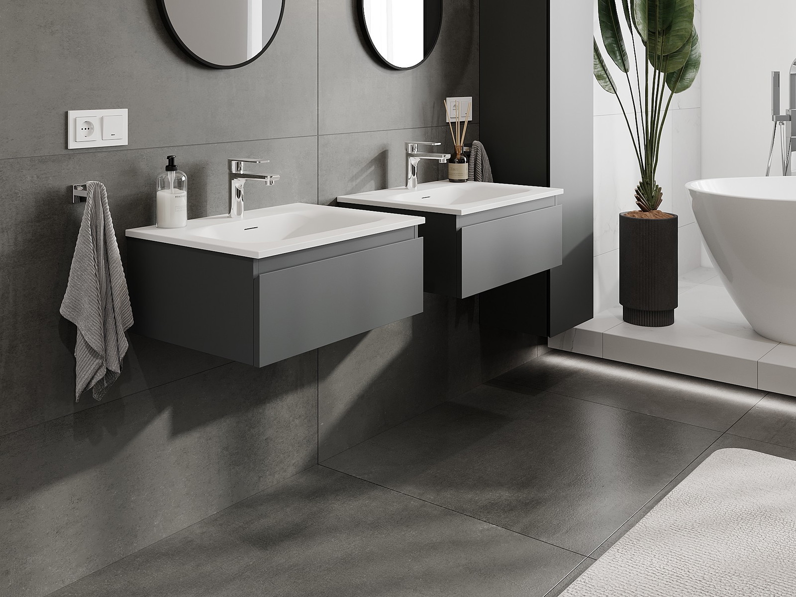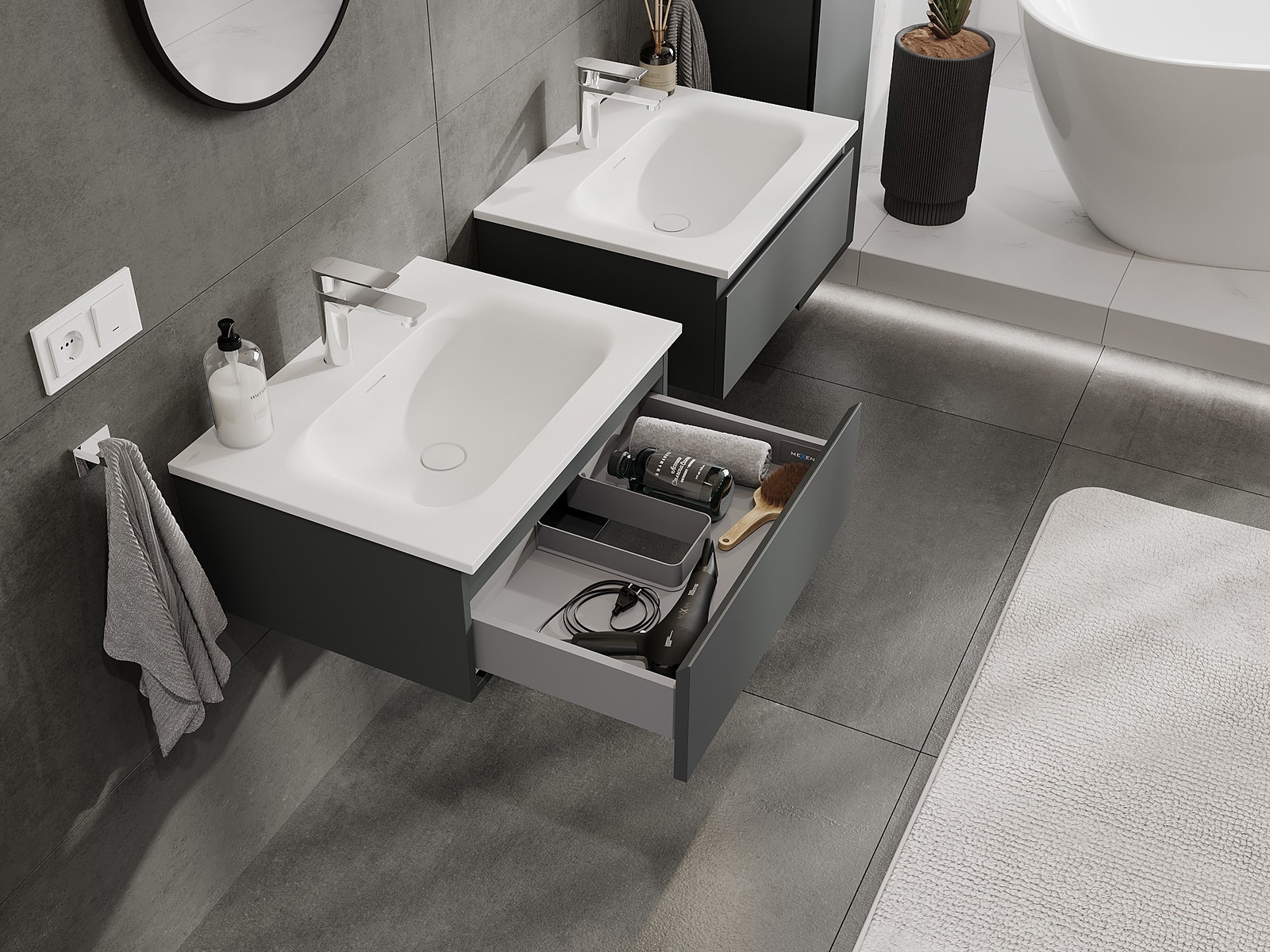 Mūsų moduliniai vonios baldai gali būti derinami tarpusavyje įvairiomis spalvų konfigūracijomis, leidžiant visiškai pritaikyti pagal asmeninius poreikius. Galima pasirinkti tiek atskirų elementų išvaizdą, tiek funkcijas, kas leidžia baldus pritaikyti pagal savo stiliaus ir naudojimo preferencijas.
