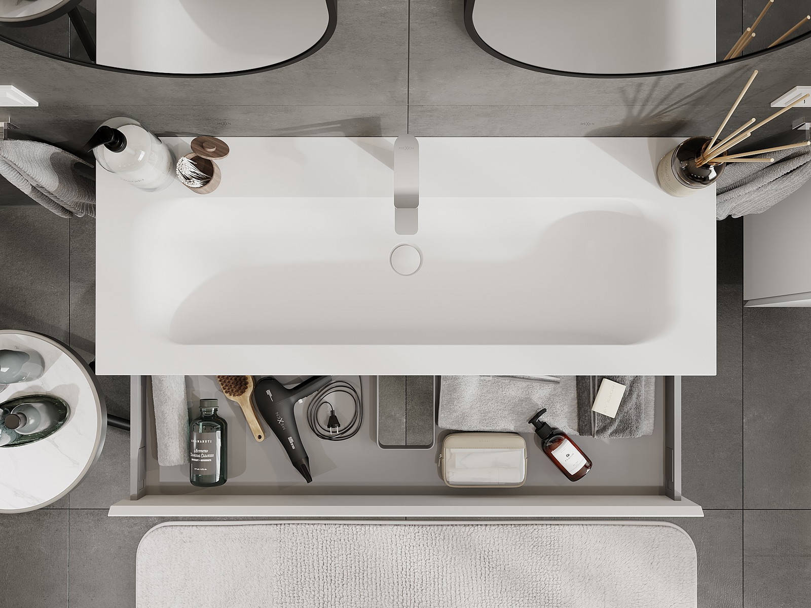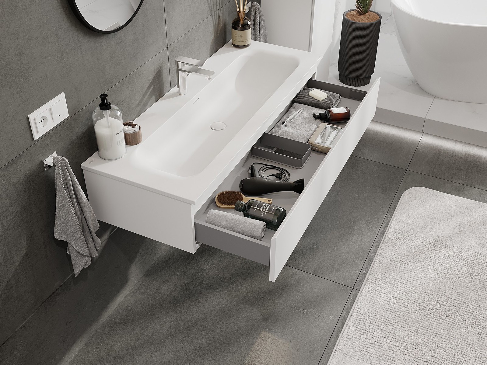 Mūsų moduliniai vonios baldai gali būti derinami tarpusavyje įvairiomis spalvų konfigūracijomis, leidžiant visiškai pritaikyti pagal asmeninius poreikius. Galima pasirinkti tiek atskirų elementų išvaizdą, tiek funkcijas, kas leidžia baldus pritaikyti pagal savo stiliaus ir naudojimo preferencijas.