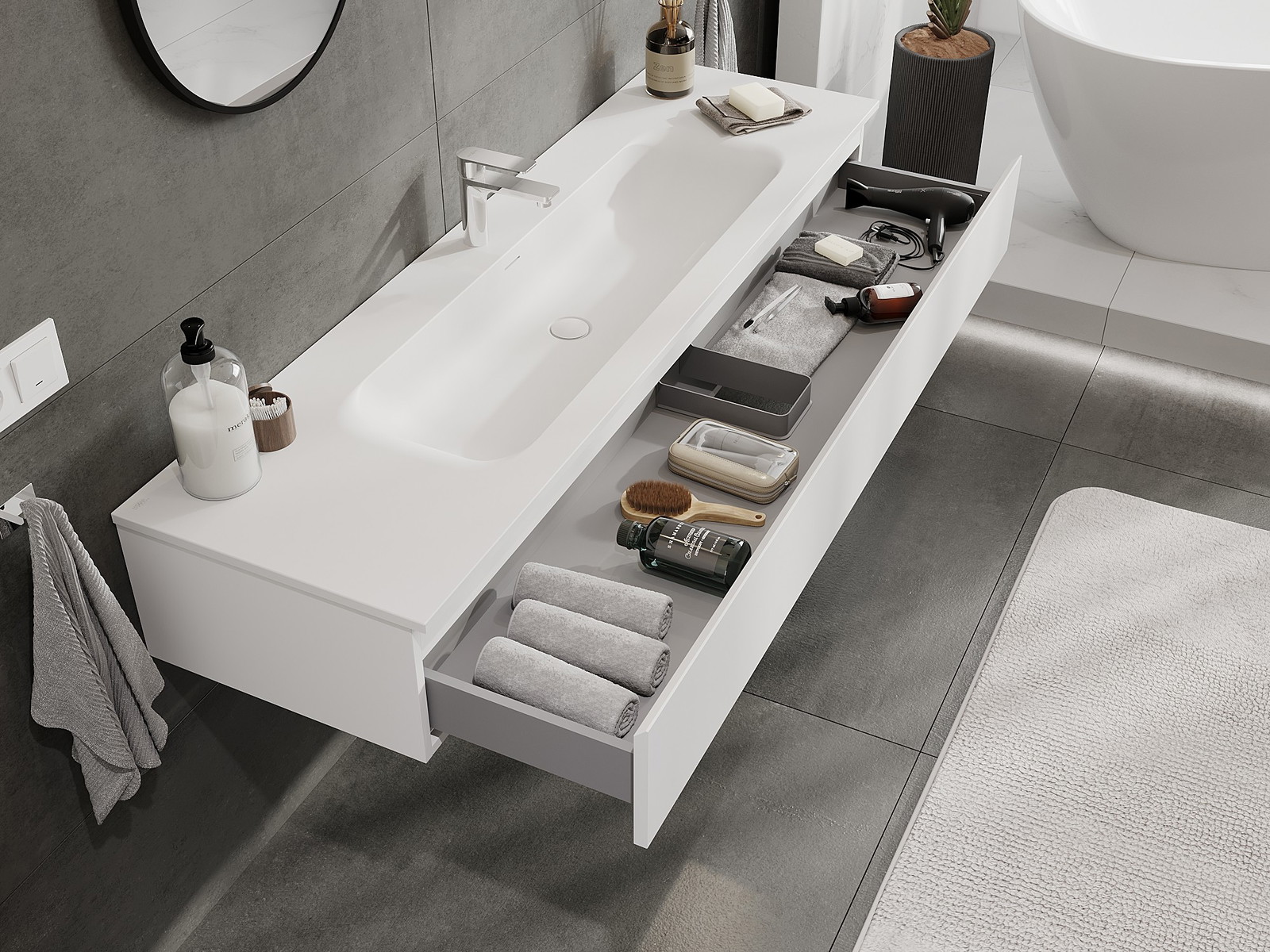 Mūsų moduliniai vonios baldai gali būti derinami tarpusavyje įvairiomis spalvų konfigūracijomis, leidžiant visiškai pritaikyti pagal asmeninius poreikius. Galima pasirinkti tiek atskirų elementų išvaizdą, tiek funkcijas, kas leidžia baldus pritaikyti pagal savo stiliaus ir naudojimo preferencijas.