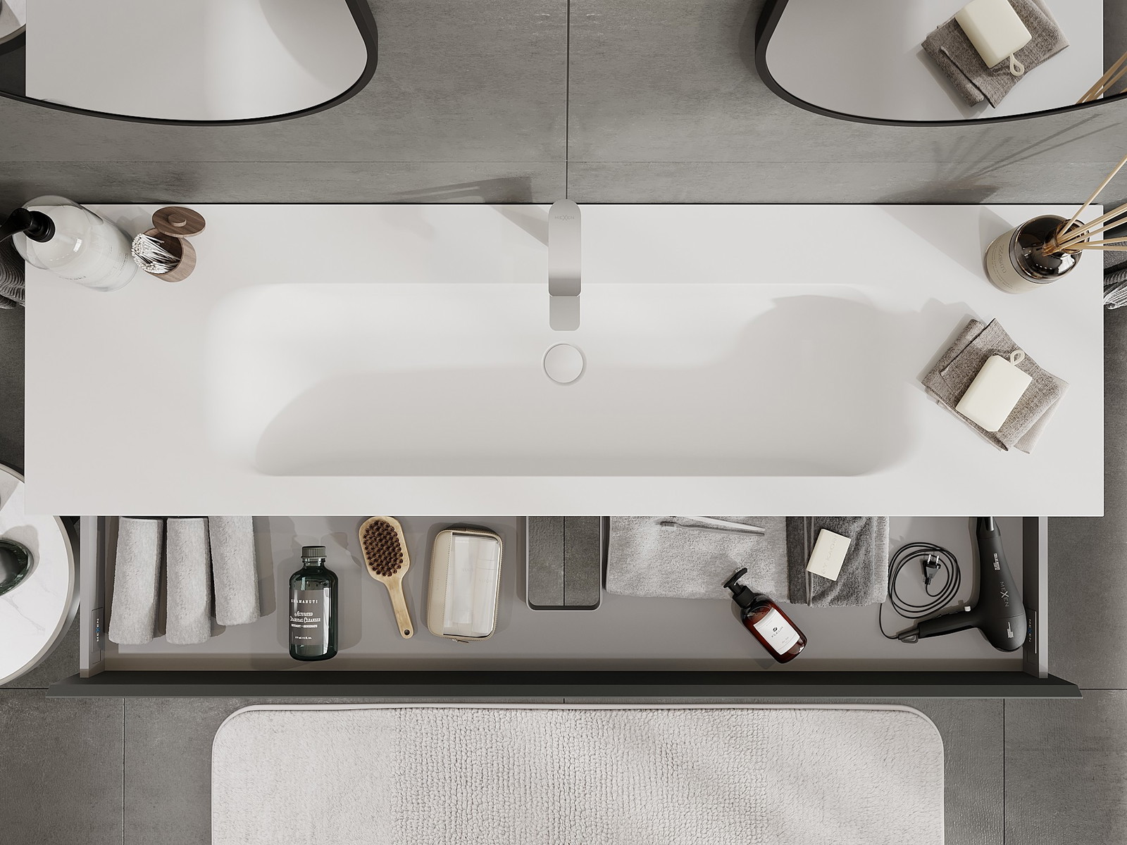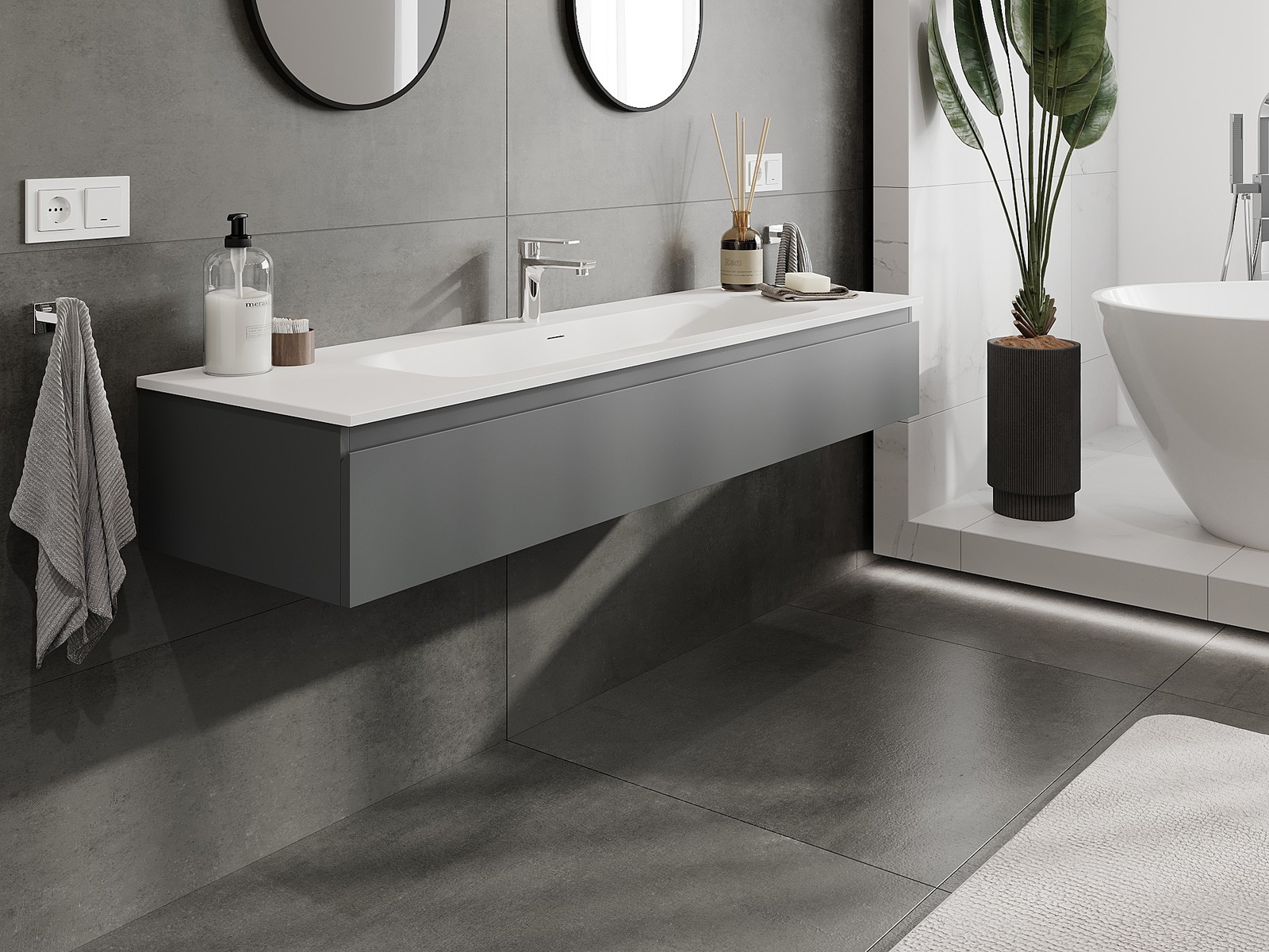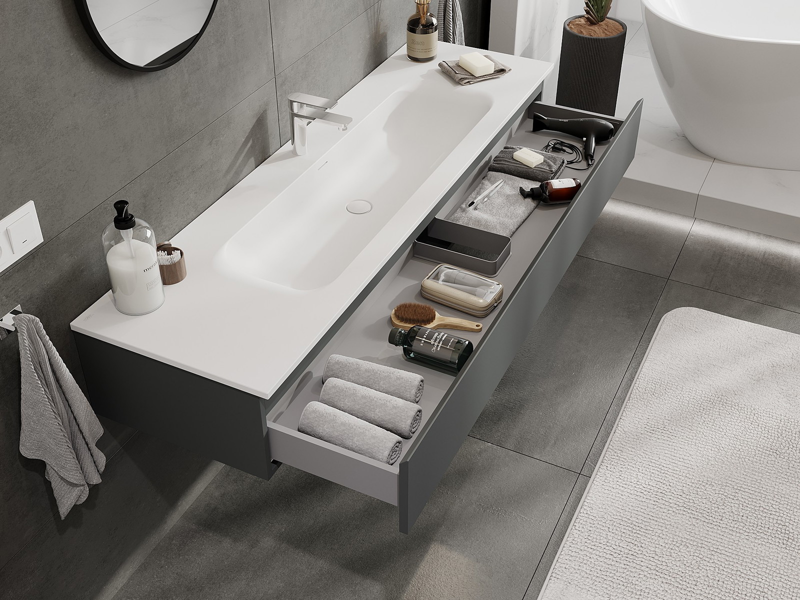 Mexen Orio vonios spintele 160 cm su praustuvu Vela, 1 stalčius, grafitas matinis/balta matinis - 91A10-16023-1-BF66-W23M01