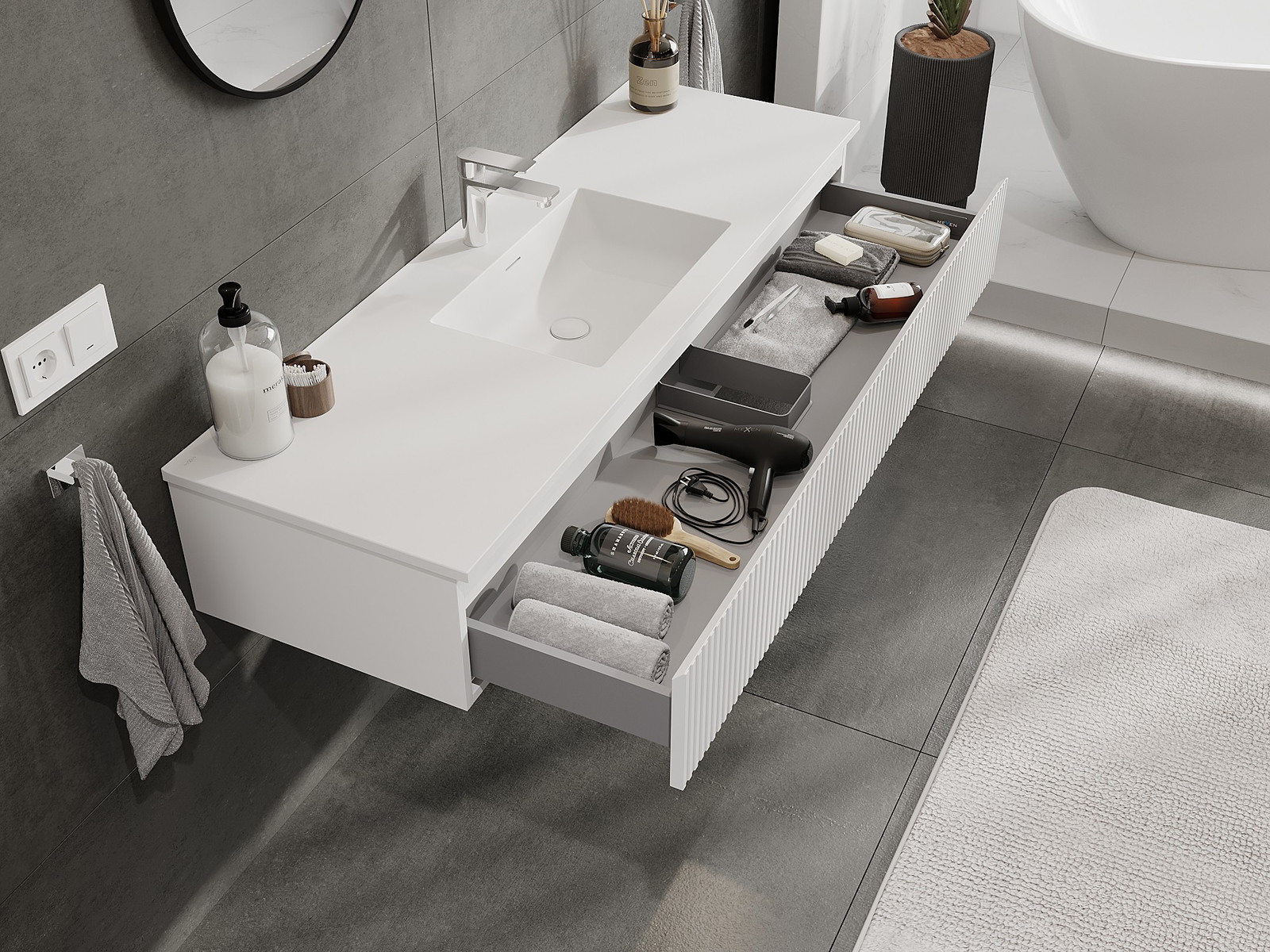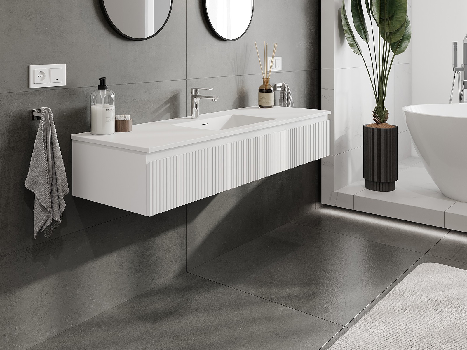 Mexen Rivel vonios kambario spintelė 140 cm su praustuvu Otis, 1 stalčius, rifliuota, balta matinė - 91A20-14023-1-BF01-W18M01